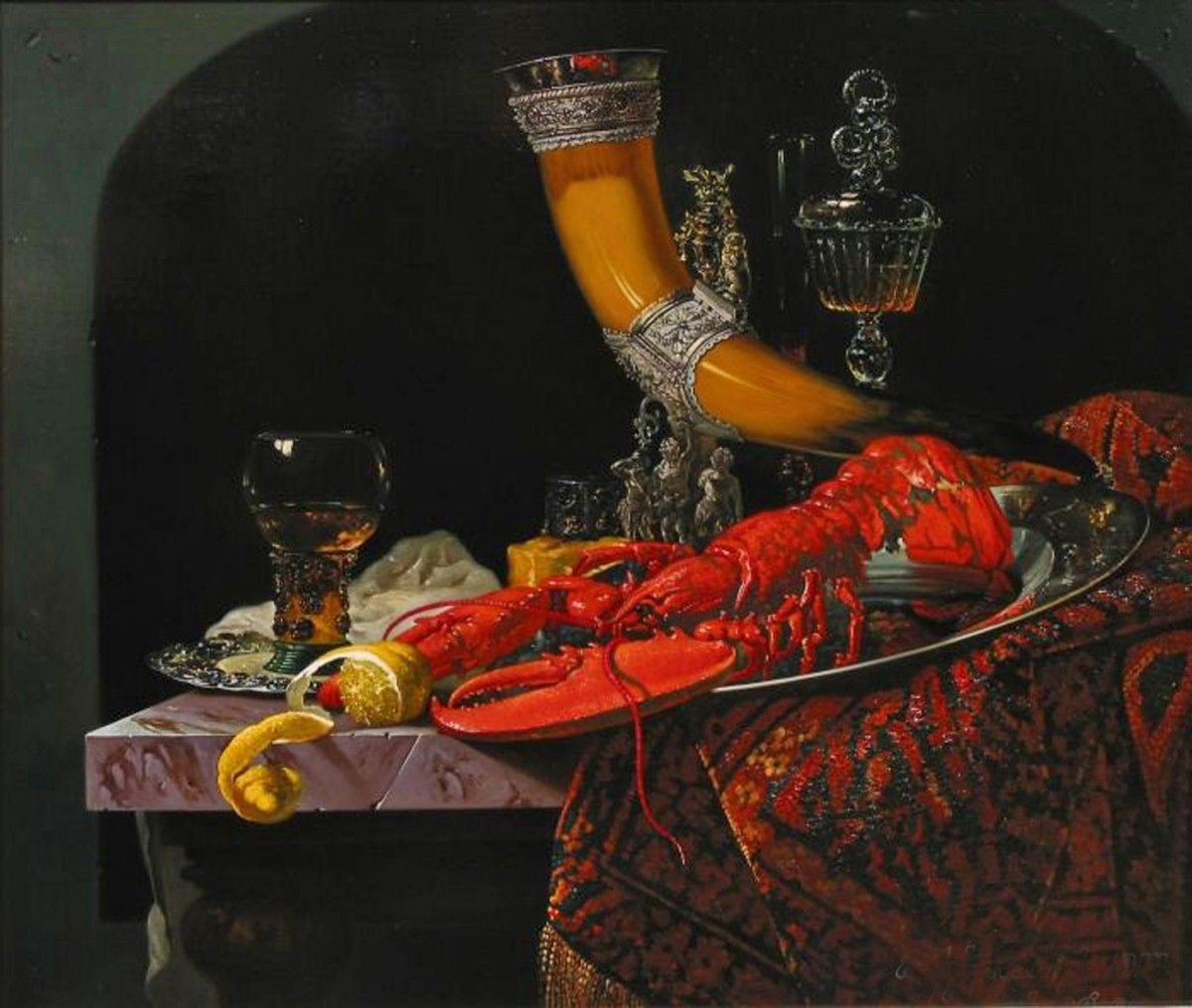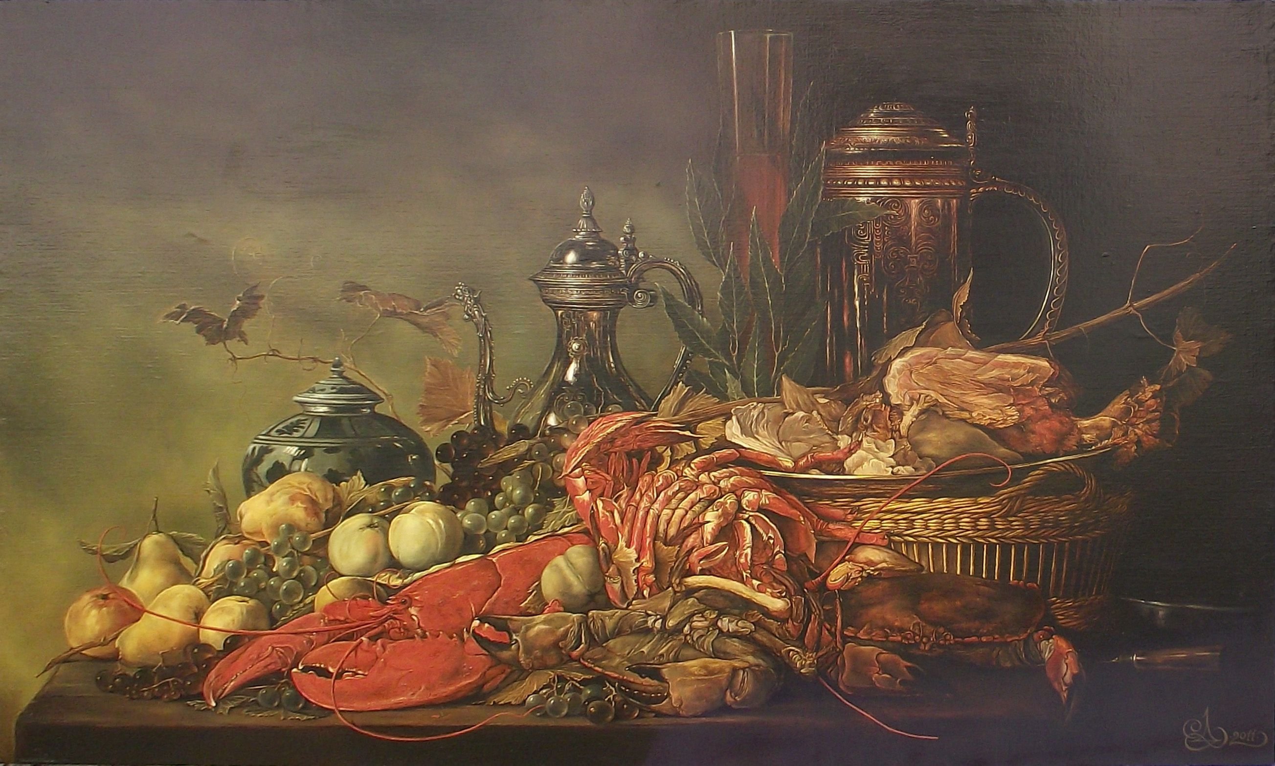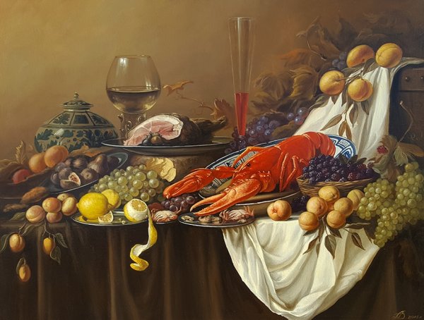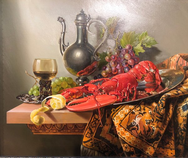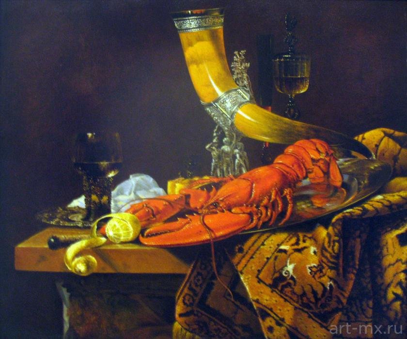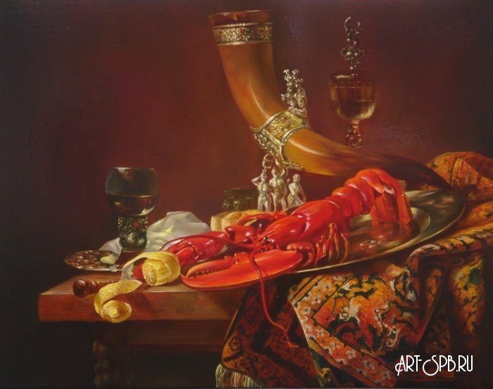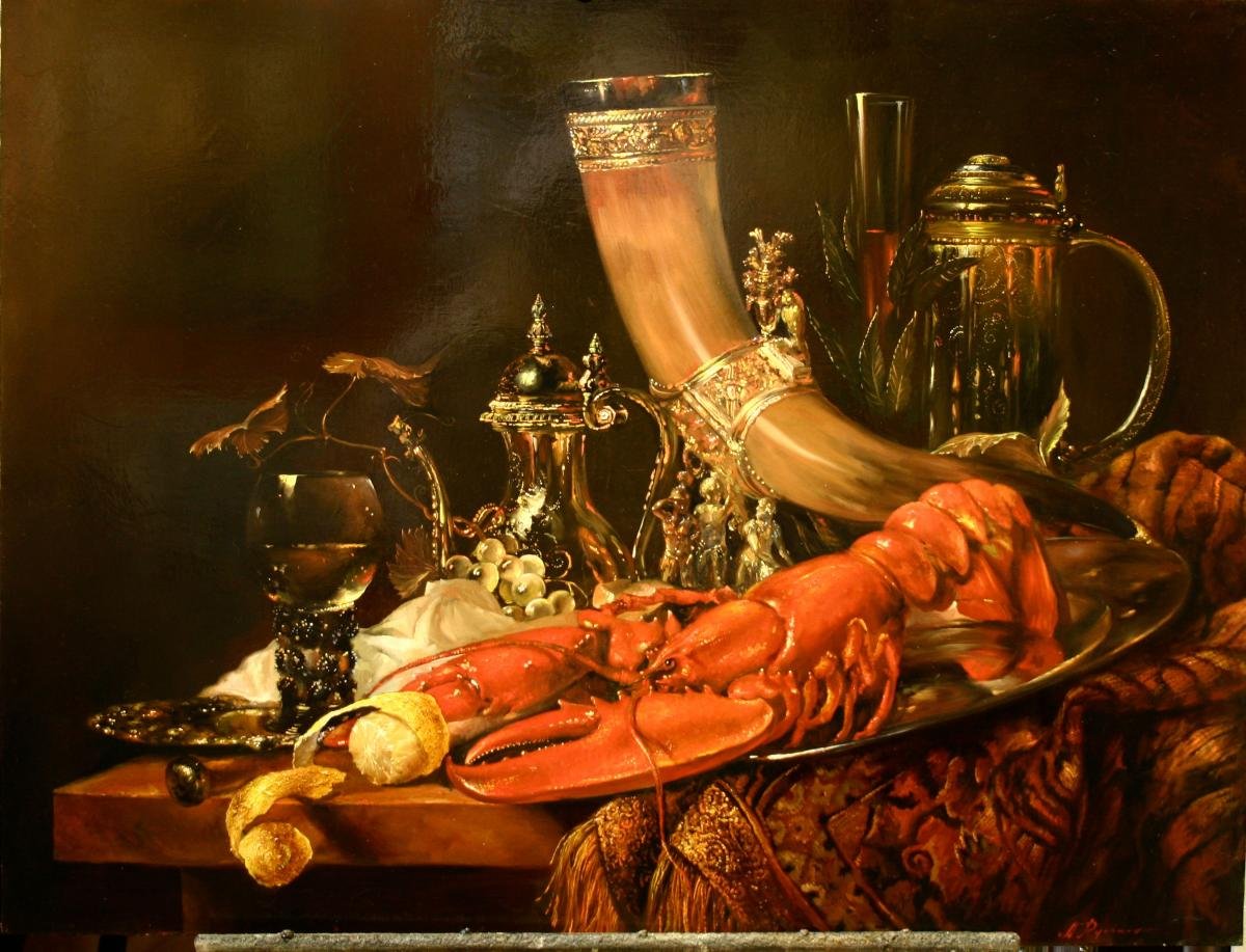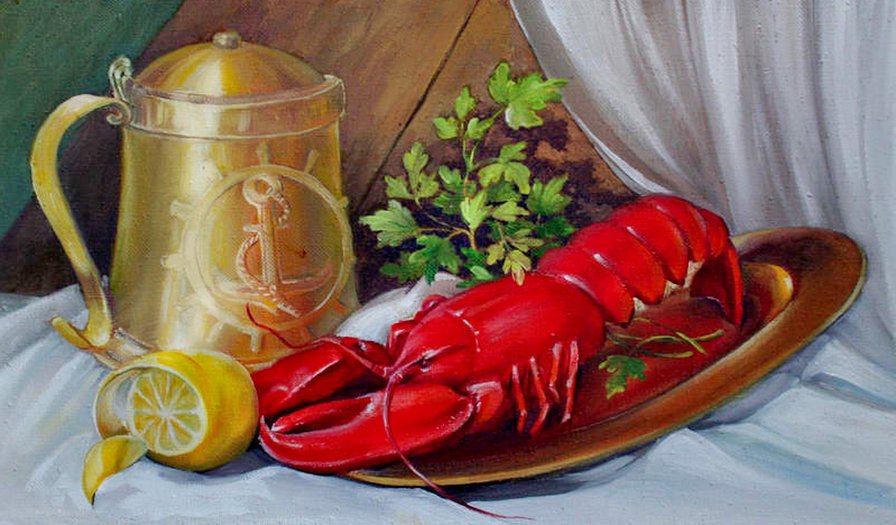 Натюрморт с омаром - это прекрасное произведение искусства, которое воплощает в себе изысканность и роскошь. В центре внимания находится свежий омар, его ярко-красная окраска и элегантные формы выделяются на фоне тщательно подобранного фона. Омар символизирует деликатесность и изысканность, придающие натюрморту особую привлекательность. Каждая деталь, начиная от свежих морских продуктов и заканчивая декоративными элементами, внимательно составлены, чтобы создать гармоничный образ. Натюрморт с омаром - это не только визуальное наслаждение, но и отражение высокого стиля и благородства.