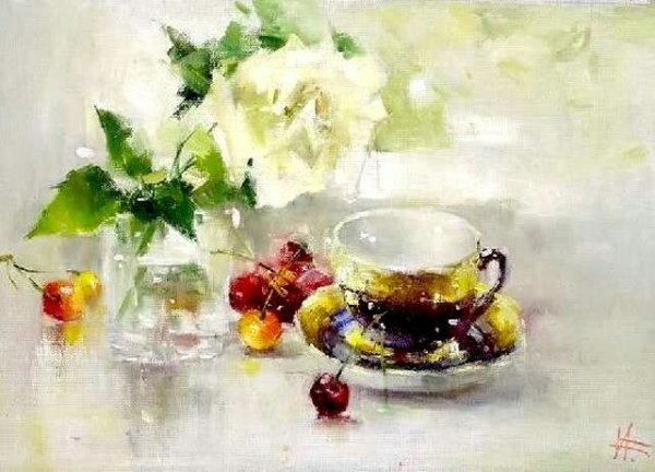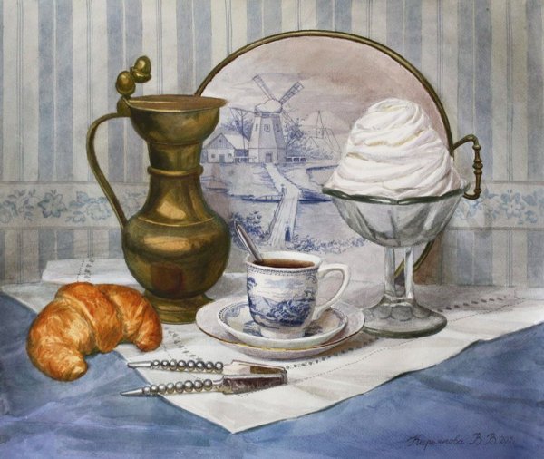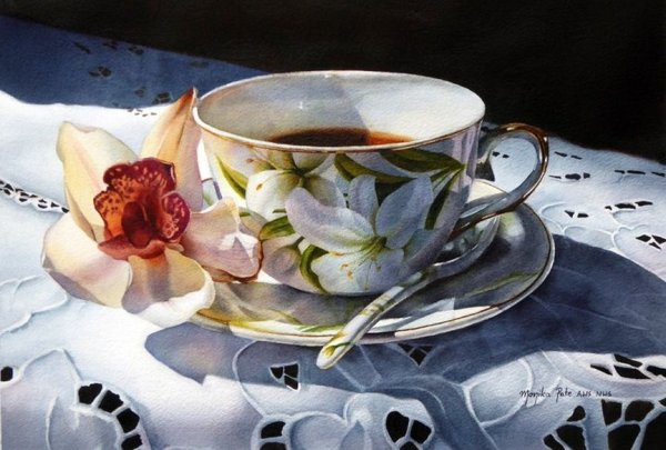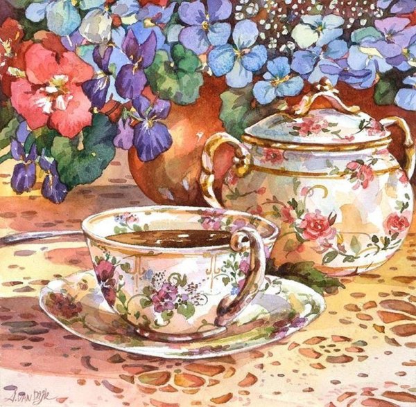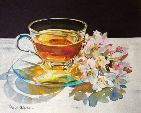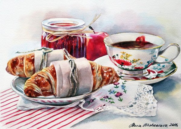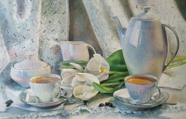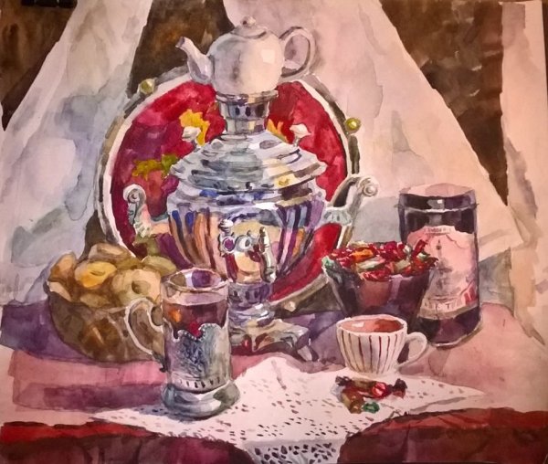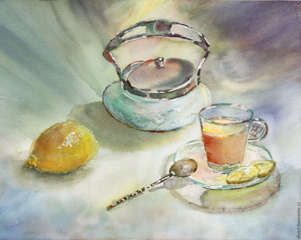 Чайный натюрморт, изображенный акварелью, это уникальное произведение искусства, которое привлекает внимание своей нежной и яркой красочностью. В этом живописном полотне представлены различные виды чая, расположенные на фоне элегантного сервиза. Каждая чашка и чайник выглядят очень реалистично и детально проработаны художником. Он сумел передать не только форму и цвет предметов, но и их текстуру, создавая ощущение реальной мягкости и объемности. Акварельные пятна и переливы добавляют особую атмосферу и легкость образу, придают ему некую таинственность и загадочность. Это произведение искусства идеально подходит для любителей чая и ценителей прекрасного, которые хотят приобрести уникальный и стильный элемент декора.