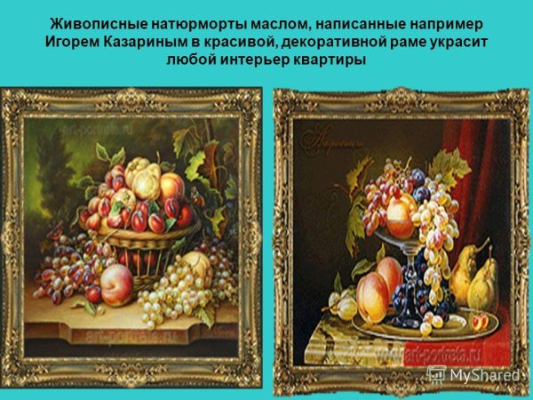 Натюрморт Игоря Казарина - это удивительное произведение искусства, которое захватывает взгляд с первого взгляда. В его работе каждый элемент строго продуман и расположен с особой тщательностью. Цветовая гамма яркая и насыщенная, что создает ощущение жизни и движения на холсте. Каждый объект, будь то цветы, фрукты или предметы быта, передают свою индивидуальность и эмоциональный заряд. Натюрморт Игоря Казарина погружает зрителя в мир красоты и гармонии, позволяя ему насладиться уникальным искусством этого талантливого художника.