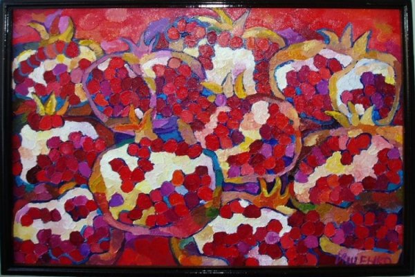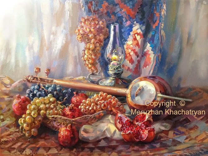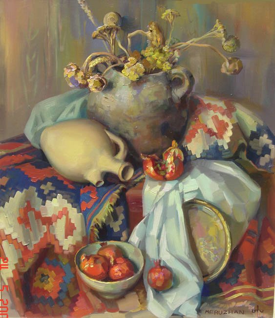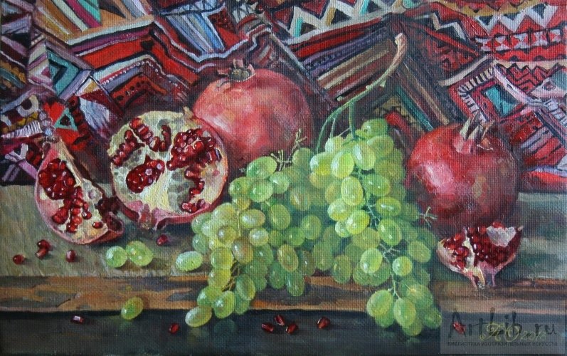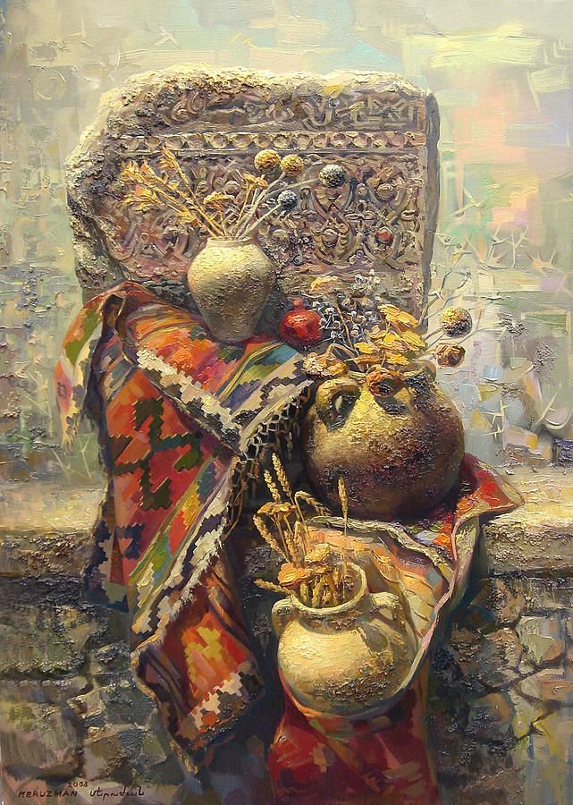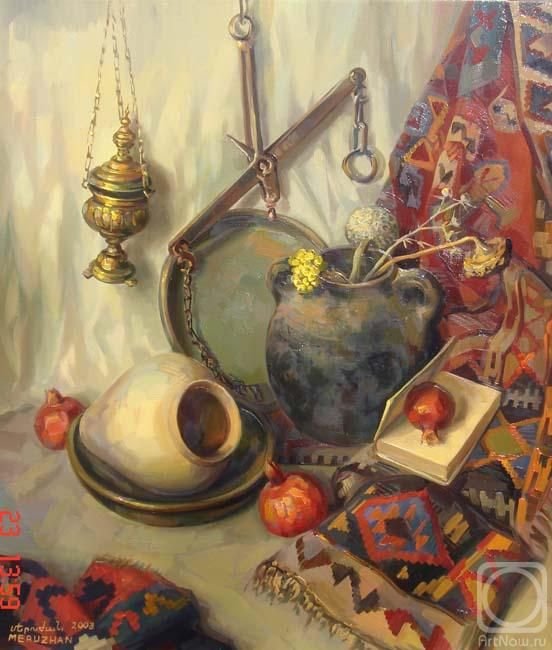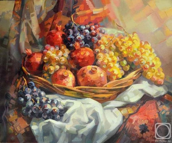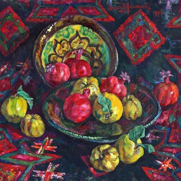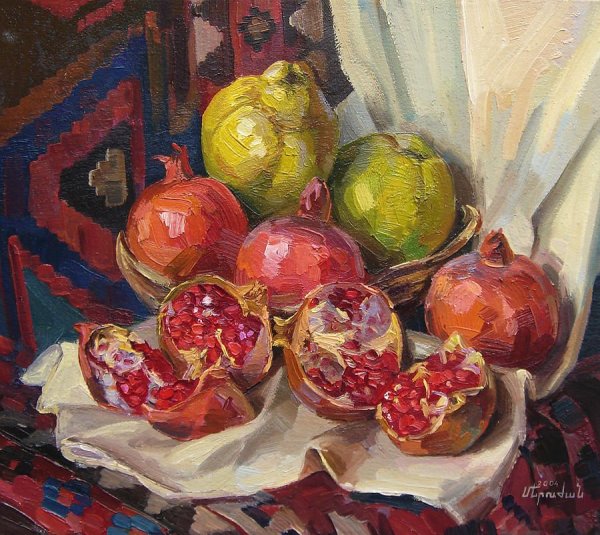 Меружан Хачатрян - известный художник, чьи произведения впечатляют своей оригинальностью и глубиной. В его натюрмортах каждый элемент имеет особое значение, создавая уникальную атмосферу и передавая эмоции зрителю. Один из таких натюрмортов - с гранатом и айвой. Гранат символизирует страсть, силу и плодородие, а айва - изящество и нежность. Композиция произведения прекрасно сбалансирована, придающая ему гармоничность и эстетическую привлекательность. Работы Меружана Хачатряна всегда вызывают интерес и восторг у ценителей искусства, привлекая своей уникальностью и тонким поэтическим подходом к созданию образа.