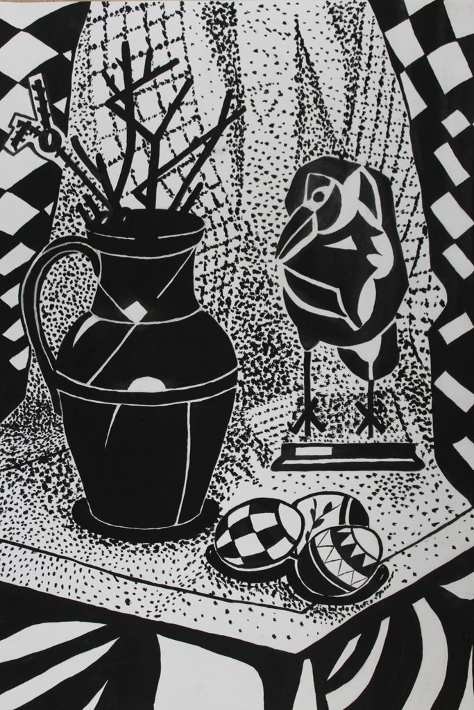 Натюрморт - это живописная композиция, которая передает объекты, такие как фрукты, цветы, посуду и другие предметы, расположенные на поверхности. В этом искусстве важную роль играют точка, линия и пятно. Точка выступает в качестве базового элемента, создавая начальную точку взгляда и устанавливая основные связи между объектами. Линия используется для подчеркивания формы и контуров объектов, добавляя им динамичность и направление. А пятно представляет собой область цвета, которая помогает создать гармонию и баланс в композиции натюрморта. Все эти элементы работают вместе, чтобы создать интересное и привлекательное изображение великолепного натюрморта.