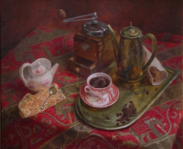 Натюрморт с кружкой - эта живописная композиция отображает изысканность и простоту. В центре внимания находится стильно оформленная кружка, которая приковывает взгляд своим уникальным дизайном и изящностью формы. Окружающие ее предметы, будь то фрукты, цветы или другие аксессуары, создают гармоничное сочетание цветов и текстур, добавляя этому натюрморту особую атмосферу и чувство реальности. Каждая деталь тщательно проработана художником, чтобы передать выразительность и эмоциональность момента. Натюрморт с кружкой является не только украшением для любого интерьера, но и отличным способом передать красоту простых вещей в искусстве.