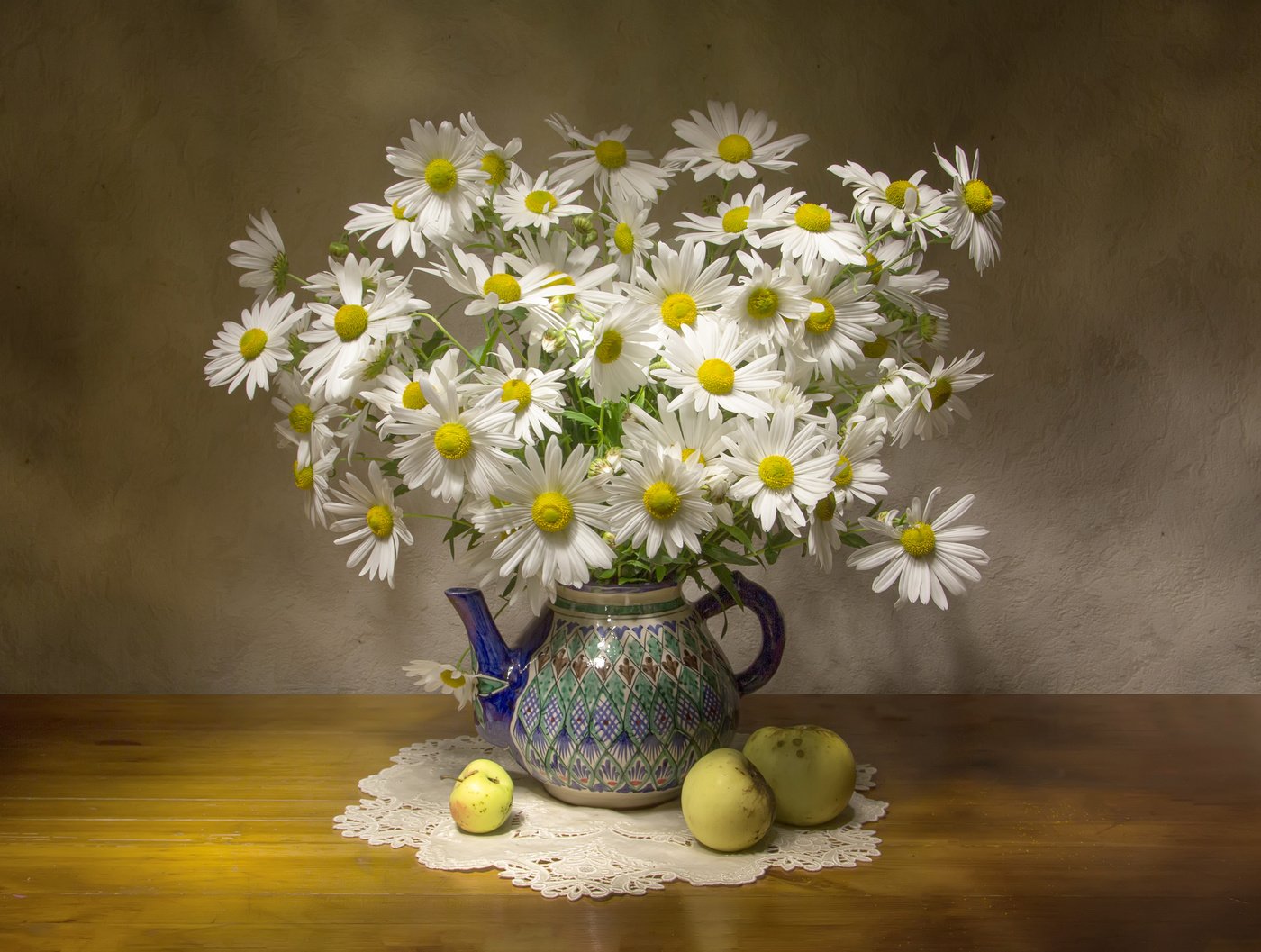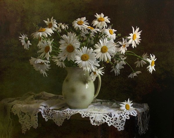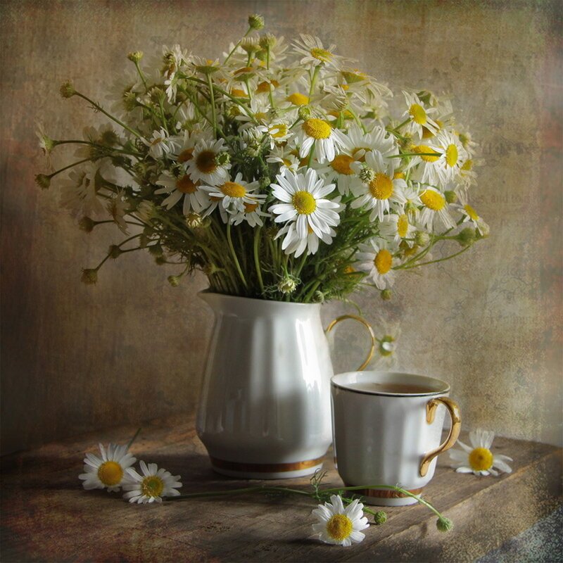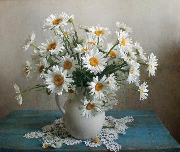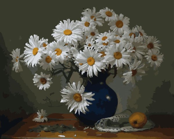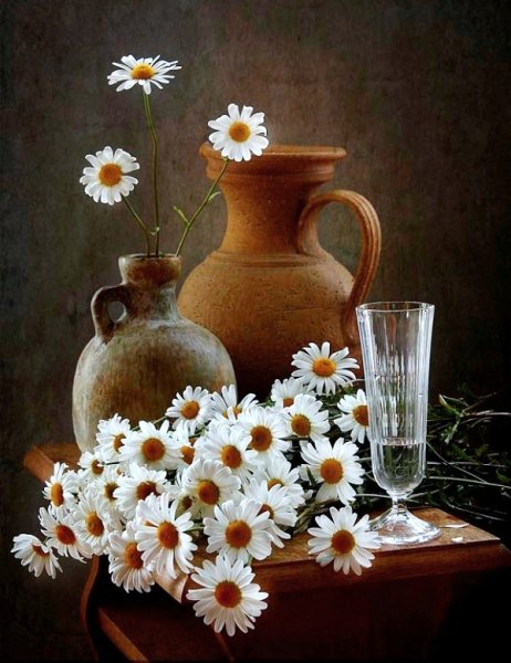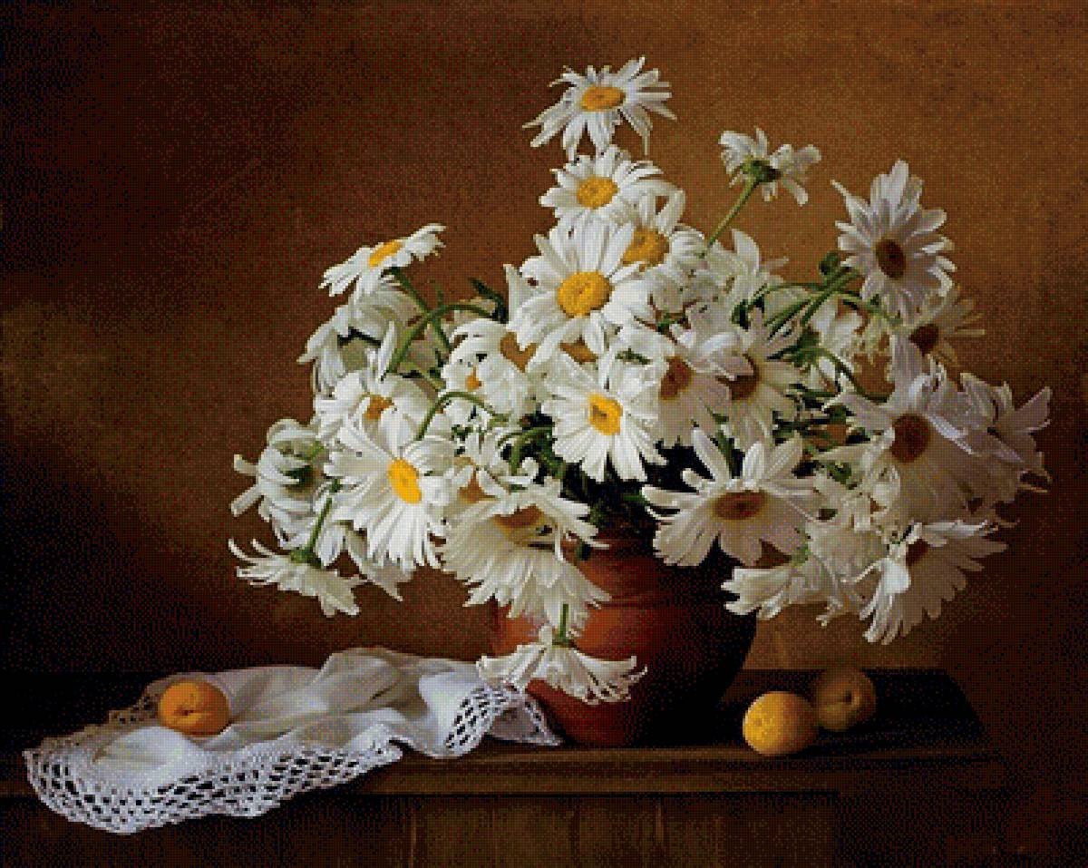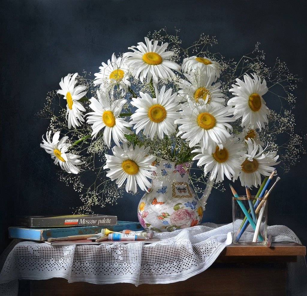 Натюрморт с ромашками - это живописная композиция, в которой изображены свежие и яркие цветы данного вида. Ромашки привлекают внимание своей нежностью, простотой и естественной красотой. Они символизируют чистоту, нежность и радость, что делает этот натюрморт прекрасным элементом декора для различных интерьеров. Натюрморт с ромашками может быть выполнен в различных стилях и техниках живописи, от классического до современного, позволяя каждому выбрать подходящий вариант в соответствии с индивидуальными предпочтениями. Такой натюрморт является универсальным и эстетически приятным объектом искусства, который способен создать атмосферу уюта и гармонии в любом помещении.