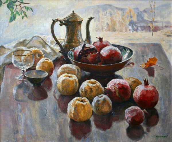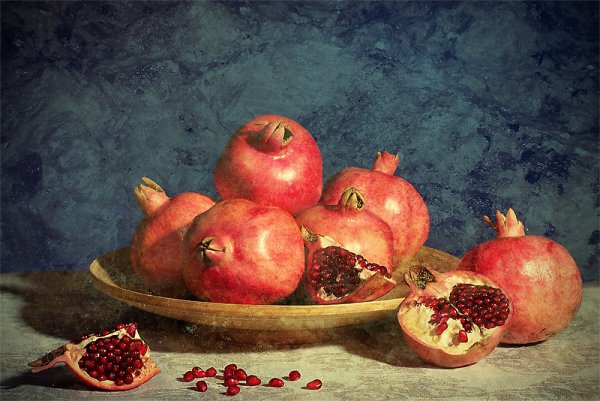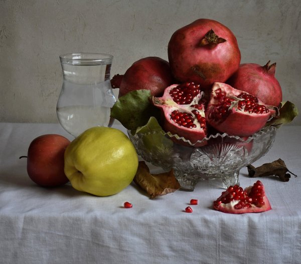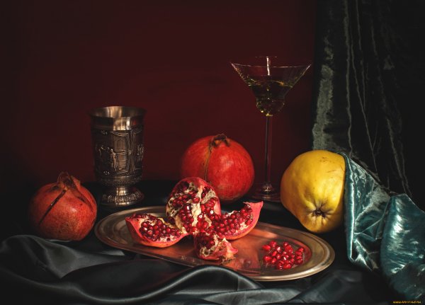Представьте себе нежный натюрморт, в котором красота и аппетитность сочетаются вместе. Главную роль в этой композиции играют гранаты и айва. На фоне пастельных оттенков высока стеклянная ваза, наполненная сочными гранатами и зрелыми айвами. Изумительные цвета и формы этих фруктов привлекают внимание и вызывают желание испытать их вкус. Каждая граната сверкает яркими каплями, словно олицетворяя жизненную силу и страсть, а айва обладает неповторимым ароматом и нежной мякотью. Этот натюрморт приносит радость и дарит возможность насладиться уникальными вкусовыми ощущениями.