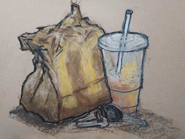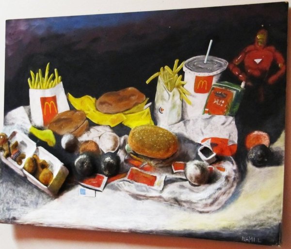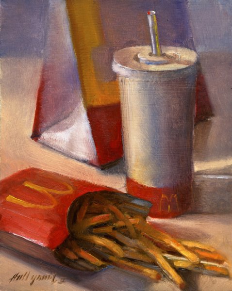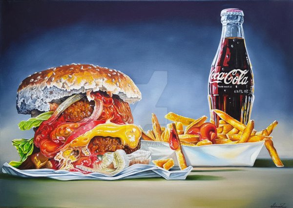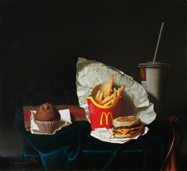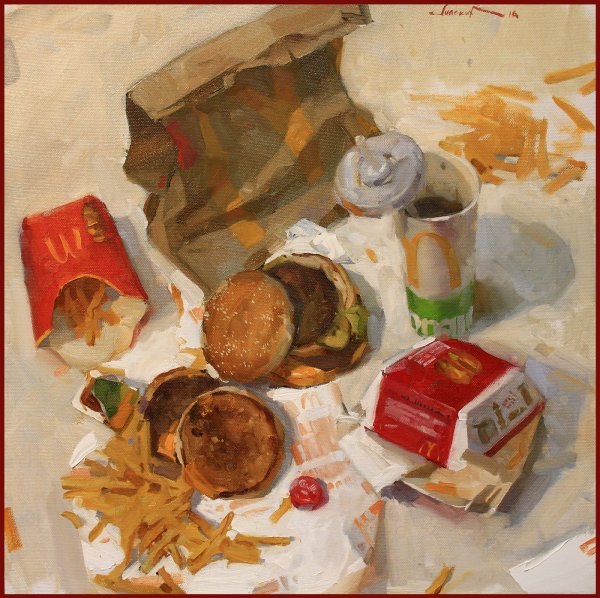 Натюрморт "Макдоналдс" - это произведение искусства, которое запечатлевает всю атмосферу и характерные детали этой популярной быстрого питания. В этом натюрморте вы можете увидеть знаменитые гамбургеры, сочные картофельные ломтики в фирменной упаковке, свежие овощи и соусы, все аккуратно разложенное на столе. Композиция привлекает внимание своей яркой цветовой гаммой, создавая аппетитные и соблазнительные образы. Натюрморт "Макдоналдс" отлично передает эстетику и узнаваемый стиль этого бренда, вызывая желание погрузиться в мир быстрого и вкусного питания.
