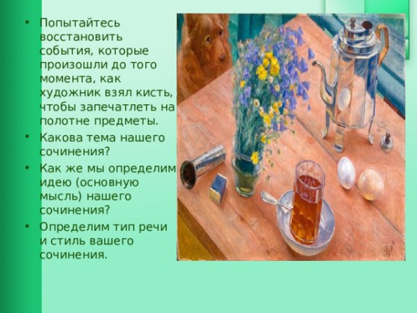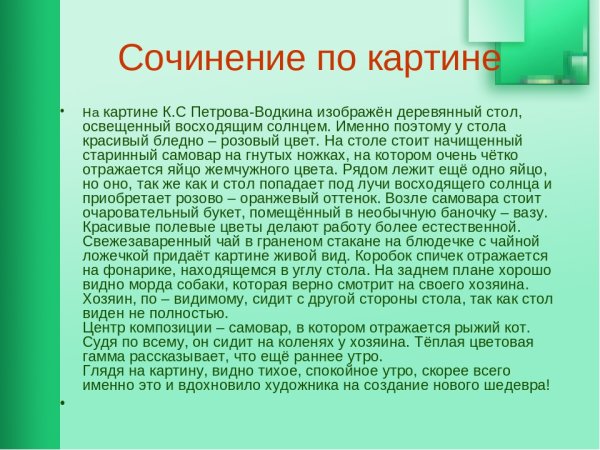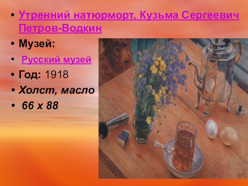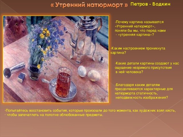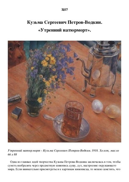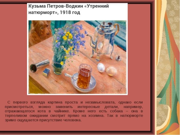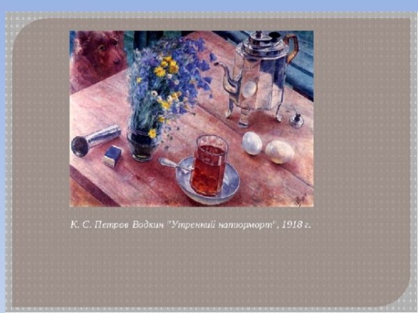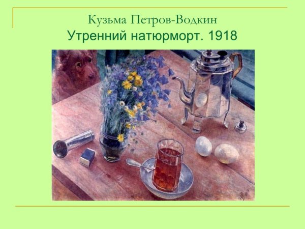 Утренний натюрморт "Кузьма Сергеевич Петров Водкин" - это произведение искусства, которое поражает своей красотой и глубиной. Картина создана талантливым художником, который сумел передать великолепие утреннего момента. На полотне можно увидеть разнообразные предметы: стаканы с водкой, фрукты, цветы. Все эти детали создают атмосферу утра, придают картине особую живость и яркость. Каждый элемент выбран с большим вкусом и точностью, что делает натюрморт еще более привлекательным для зрителя. Утренний натюрморт "Кузьма Сергеевич Петров Водкин" олицетворяет идеальное начало дня, настоящую гармонию и радость от прекрасного. Это не просто картина, это настоящий шедевр искусства, который способен вызвать самые позитивные эмоции у своих зрителей.