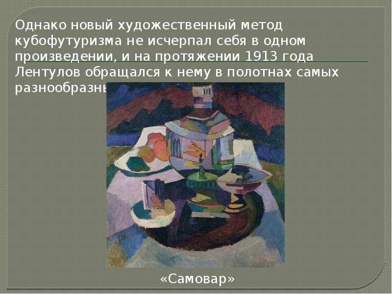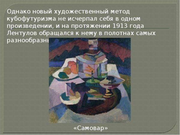 Изысканный и элегантный, самовар натюрморт Лентулова пленит своей изящностью и утонченностью. Великолепное произведение искусства, оно является воплощением мастерства художника и его тонкого восприятия окружающего мира. Композиция заполнена атмосферой спокойствия и гармонии, где каждая деталь пропитана заботливой рукой автора. Самовар, символ русской традиции и гостеприимства, стал главным акцентом произведения, вызывая чувство уюта и тепла. Насыщенные цвета и прекрасная игра света создают впечатление живости и реалистичности, словно можно почувствовать аромат чая, нежно поднимающийся из самовара. Это произведение искусства способно оживить любое помещение и станет настоящим украшением вашего интерьера.