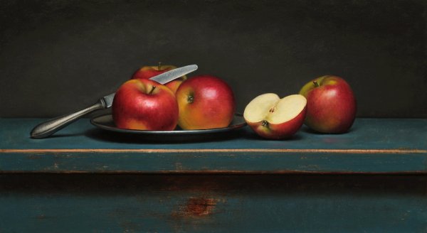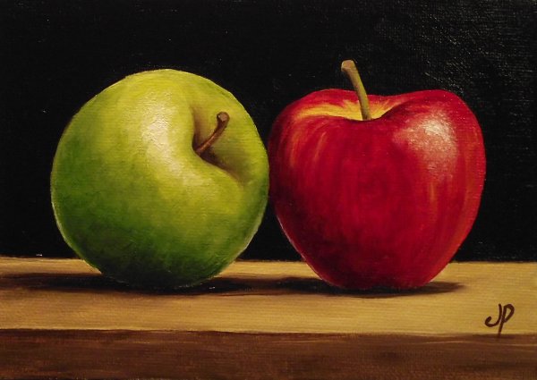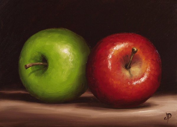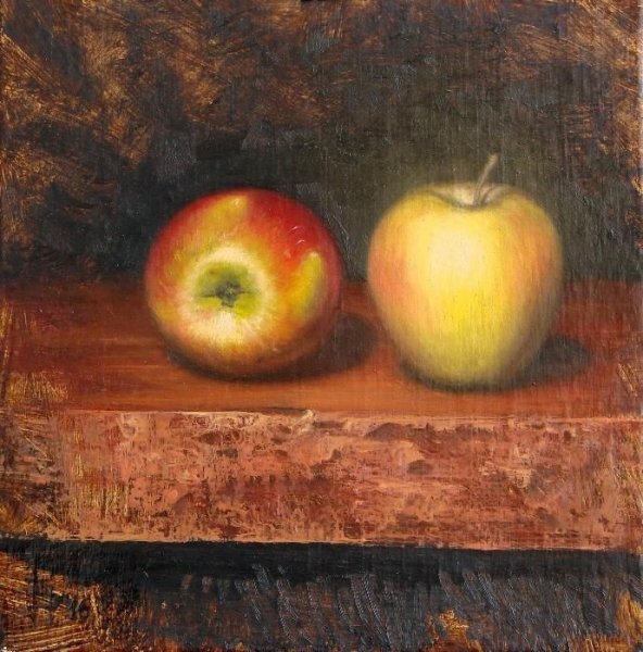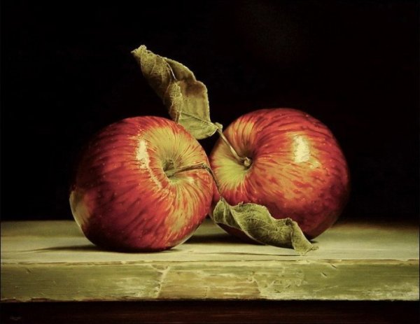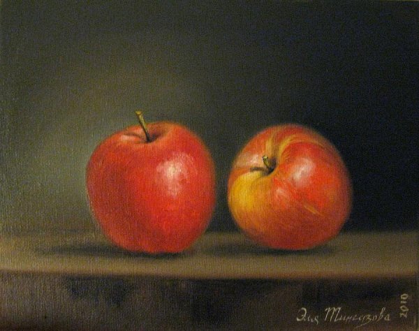 На холсте живописца расположены два изумительных яблока, создающих прекрасный натюрморт. Эти пышные плоды природы вызывают насыщенные эмоции и притягательность своей формой, цветом и текстурой. Ярко-красная кожура каждого яблока отчетливо выделяется на темном фоне, придавая композиции динамизм и гармонию. Их сочное мякоть словно приглашает погрузиться в мир богатства и обилья, наполняет пространство ароматом свежести и сладости. Два яблока на натюрморте - это символ вкуса, питательности и здоровья, олицетворение человеческой природы и ее внутреннего богатства. Картина приковывает взгляд и заставляет задуматься о прекрасном, сияющем и бесконечном многообразии природы.