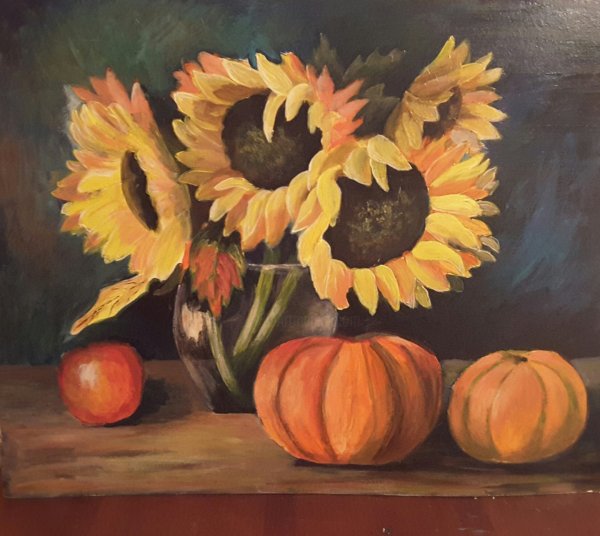 Натюрморт с подсолнухами, выполненный в технике гуашь, - это живописная композиция, которая привлекает внимание своей яркостью и насыщенностью цветов. Золотистые лепестки подсолнухов создают чувство тепла и солнечного настроения. Они выделяются на фоне нежных оттенков фиолетовых и синих тонов, которые придают работе глубину и атмосферность. Каждый детально проработанный элемент добавляет реализма и реальности к картине. Это произведение искусства способно оживить интерьер любого помещения и стать ярким акцентом, который вызывает положительные эмоции и восхищение у зрителей.