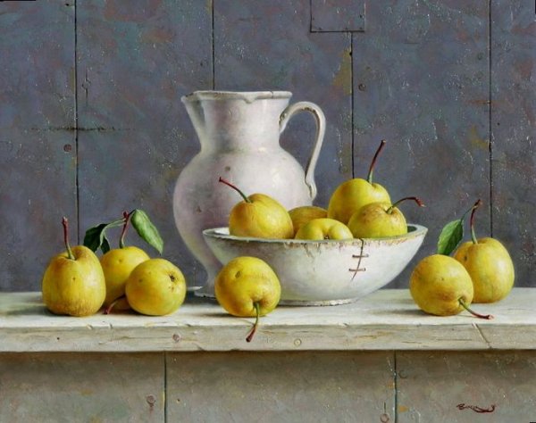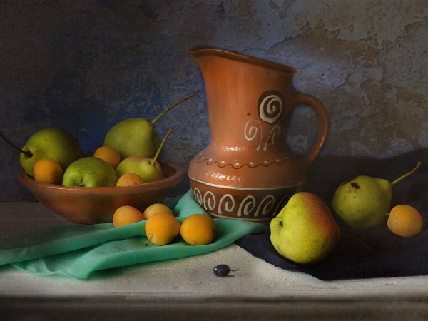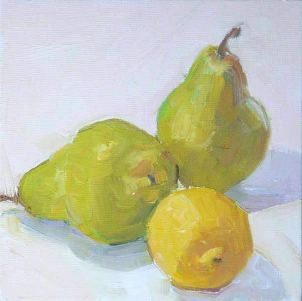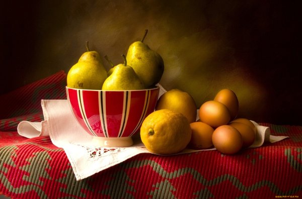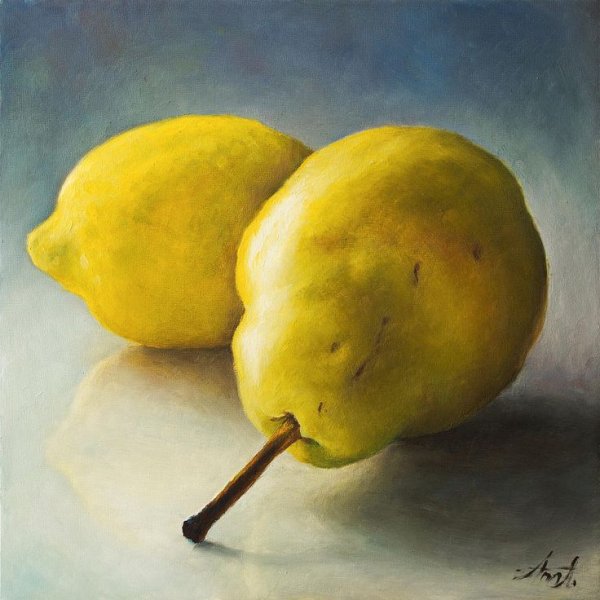 Натюрморт "Груша и лимон" - это художественное изображение, в котором два фрукта становятся главными героями. Груша и лимон размещены на подставке или столе, создавая яркую композицию сочетанием своих форм, цветов и текстур. Изображение передает ощущение свежести и живости, благодаря яркой желтой окраске лимона и сочной зеленой груши. Разнообразие оттенков и тонкие переходы в цветах придают натюрморту реалистичность и объемность. Это произведение искусства излучает приятную энергию, вызывая у зрителя аппетит и чувство гармонии. Натюрморт "Груша и лимон" является прекрасным дополнением для интерьера, добавляя свежий акцент и приятный визуальный опыт.