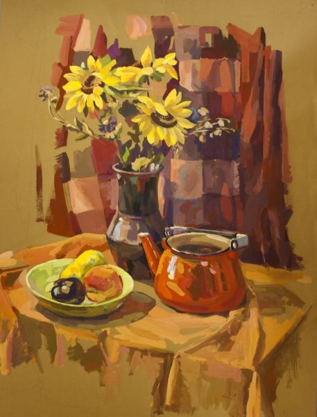 Натюрморт в теплых тонах гуашью - это произведение искусства, созданное с использованием гуаши, которая обладает насыщенными и яркими цветами. В этом натюрморте представлены различные предметы, такие как фрукты, цветы или другие объекты, расположенные в таком порядке, чтобы передать ощущение уюта и тепла. Теплые тона вносят особую атмосферу в работу, создавая ощущение комфорта и спокойствия. Используя гуашь, художник может добиться особого эффекта и показать глубину цветов и текстур объектов. Натюрморт в теплых тонах гуашью является прекрасным дополнением к интерьеру, добавляя красоту и стиль в любое помещение.