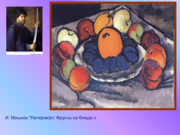 Великолепный натюрморт Машкова "Фрукты на блюде" захватывает зрителя своей яркостью и живостью. Картина наполнена разнообразными фруктами, расставленными аккуратно на старинном серебряном блюде. Сочные апельсины, сладкие груши, спелые яблоки и сочные виноградные грозди создают ощущение полного обилия и пышности. Взгляд невольно задерживается на каждом детале - благородном отблеске фруктов, искристых каплях росы и тонкой переливающейся текстуре блюда. Художник с легкостью передает естественность и привлекательность фруктов, вызывая у зрителя чувство голода и желание окунуться в этот мир сочных ароматов и ярких цветов. Картина "Фрукты на блюде" Машкова является идеальным примером его мастерства и способности оживить предметы, делая их поистине уникальными и привлекательными.