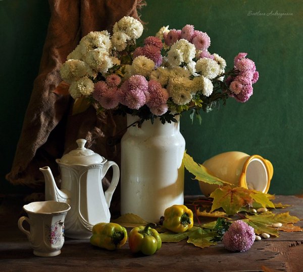 Изящная хризантема, расцветающая во всем своем великолепии, становится точкой фокуса в этом уникальном натюрморте. Ее яркие лепестки создают контраст с холодным металлическим блеском бидона радиатора, что вносит элементы неожиданности и гармонии в это произведение искусства. Казалось бы, два совершенно разных предмета, объединенные вместе в этом натюрморте, символизируют сложность и многообразие нашей жизни. Лабиринт метафорически отражает путешествие человека сквозь преграды и испытания, а хризантема и бидон радиатора становятся символами возможностей и переживаний, которые мы можем встретить на нашем пути. Это натюрморт, который вызывает размышления и вдохновляет нас обнаружить красоту и смысл в самых неожиданных вещах.