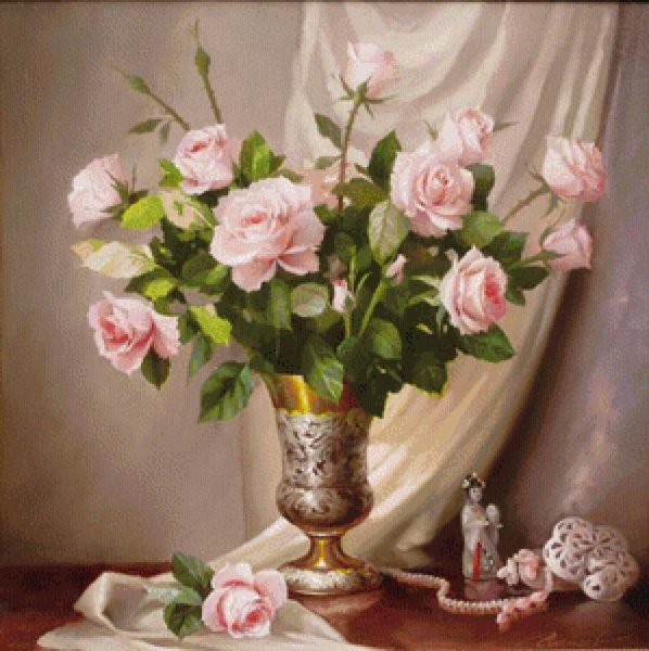 Натюрморт "Розы в вазе" - это живописная композиция, в которой изображены свежие и нежные розы, расположенные в элегантной вазе. Этот натюрморт является ярким примером искусства, где внимание уделяется красоте и совершенству природы. Каждая роза излучает свою уникальную энергию и эмоциональность, захватывая взгляд зрителя. Цветы здесь запечатлены в своей естественной красе, с контрастными оттенками лепестков и насыщенными цветами, создавая чувство жизни и радости. Натюрморт "Розы в вазе" является прекрасным украшением для интерьера, добавляя в него нотку романтики, элегантности и свежести. Восхищайтесь этим произведением и позвольте ему уносить вас в мир красоты и гармонии природы.