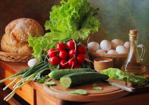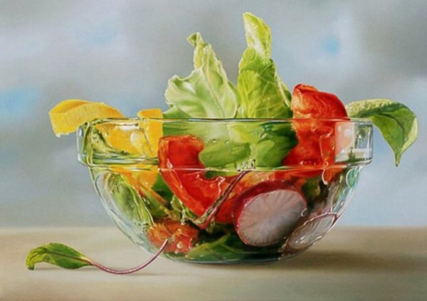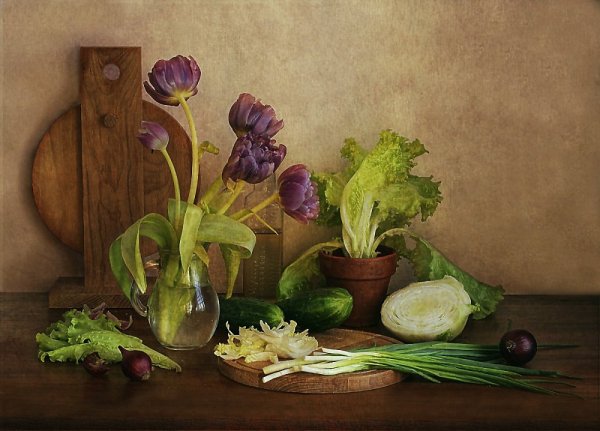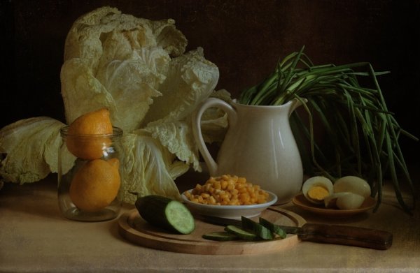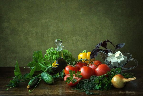 Салат "Натюрморт" - это восхитительное сочетание свежих и сочных овощей, которое создает на твоем тарелке настоящее произведение искусства. Каждый ингредиент в этом салате представляет собой яркую красочную кисть, которая добавляет разнообразие и аппетитность. Хрустящие листья салата, сочные помидоры, спелые огурцы, сладкий перец и ароматные зеленые луковицы - все это великолепно сочетается вместе, создавая неповторимый вкусовой букет. Салат "Натюрморт" - это не только блюдо для глаз, но и настоящий праздник для вкусовых рецепторов. Он станет отличным выбором для легкого обеда или ужина, подарив прекрасное настроение и положительные эмоции. Насладись вкусом и красотой салата "Натюрморт"!