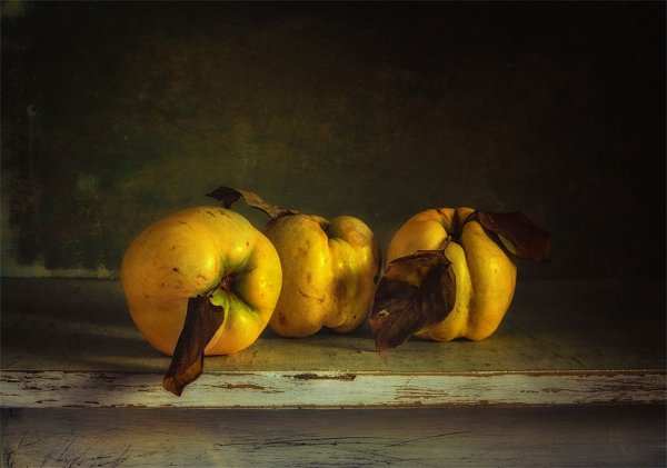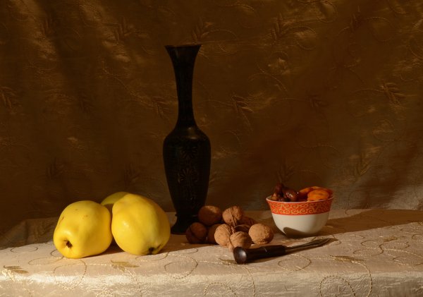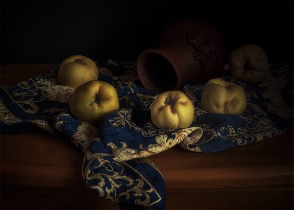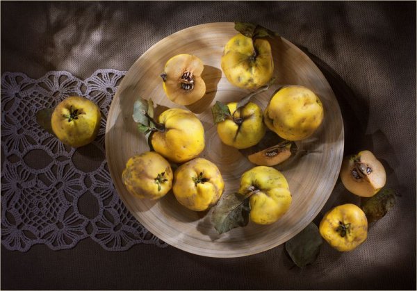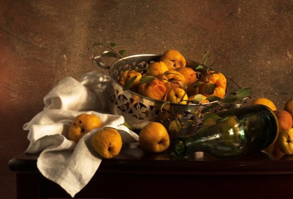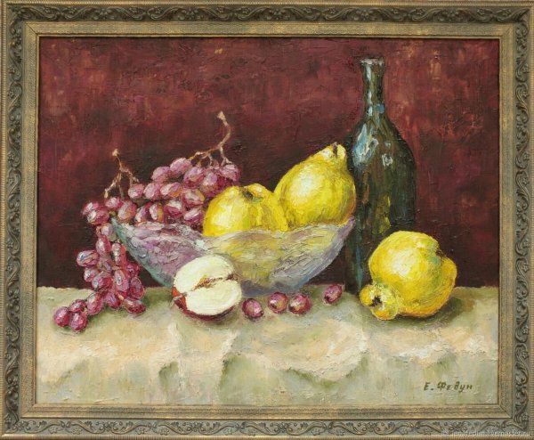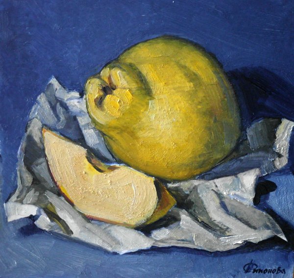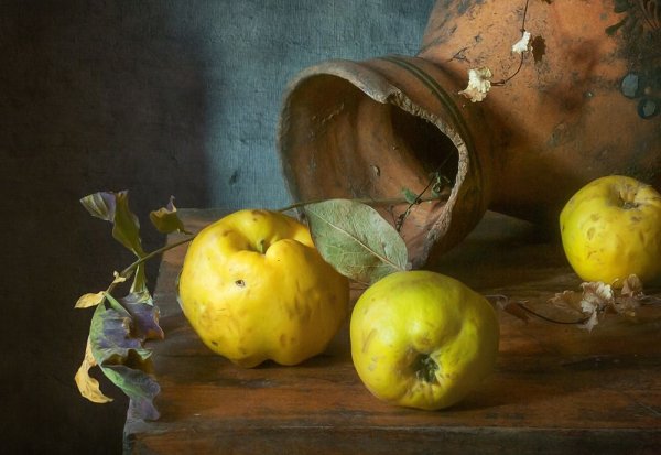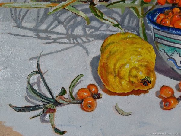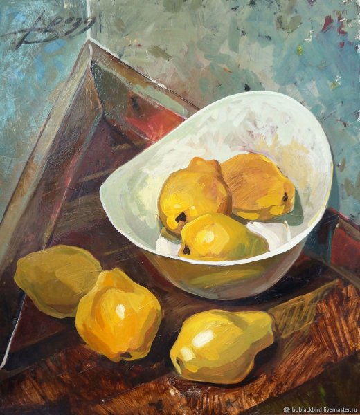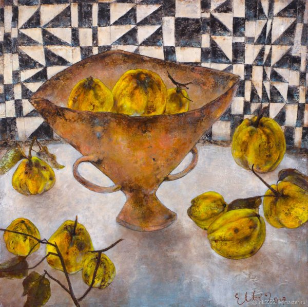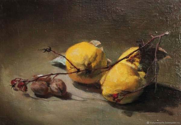 Натюрморт с айвой - это живописное произведение, в котором яркие и сочные плоды айвы становятся главными героями. Картина захватывает своей простотой и одновременно удивительной красотой. Художник смело играет с оттенками зелени, создавая эффектный контраст между темными листьями и яркими оранжевыми и красными плодами. Натюрморт с айвой выглядит очень реалистично, словно можно потрогать каждый плод и почувствовать его неповторимый аромат. Это произведение искусства наполняет пространство теплотой и природной энергией, вызывает желание окунуться в мир природы и насладиться ее богатством.