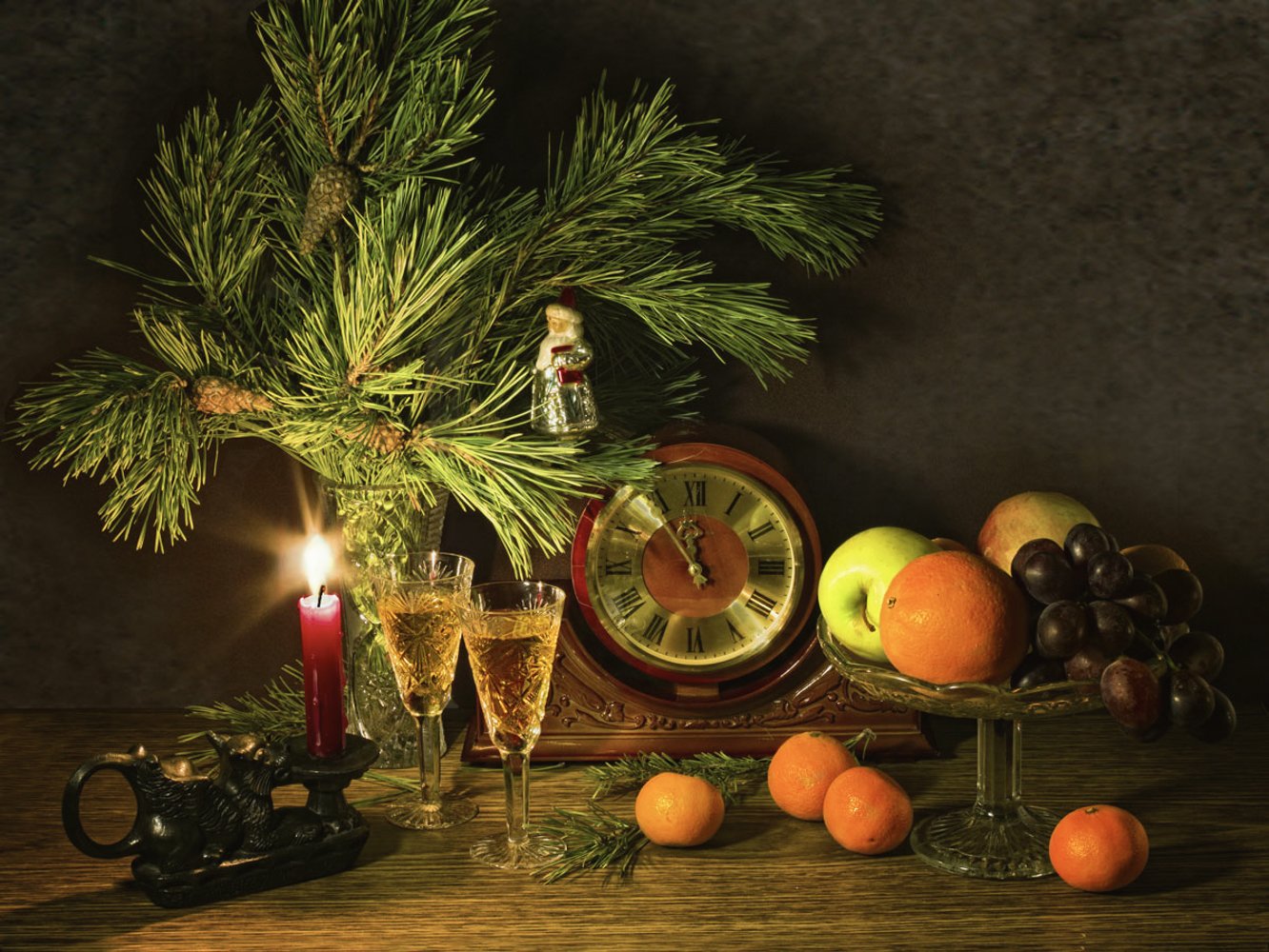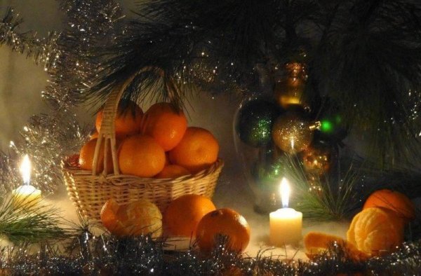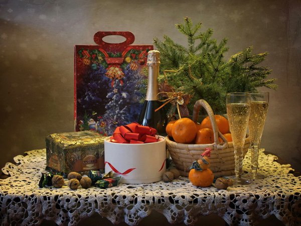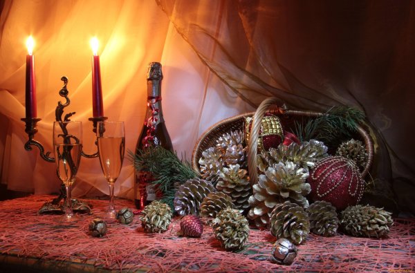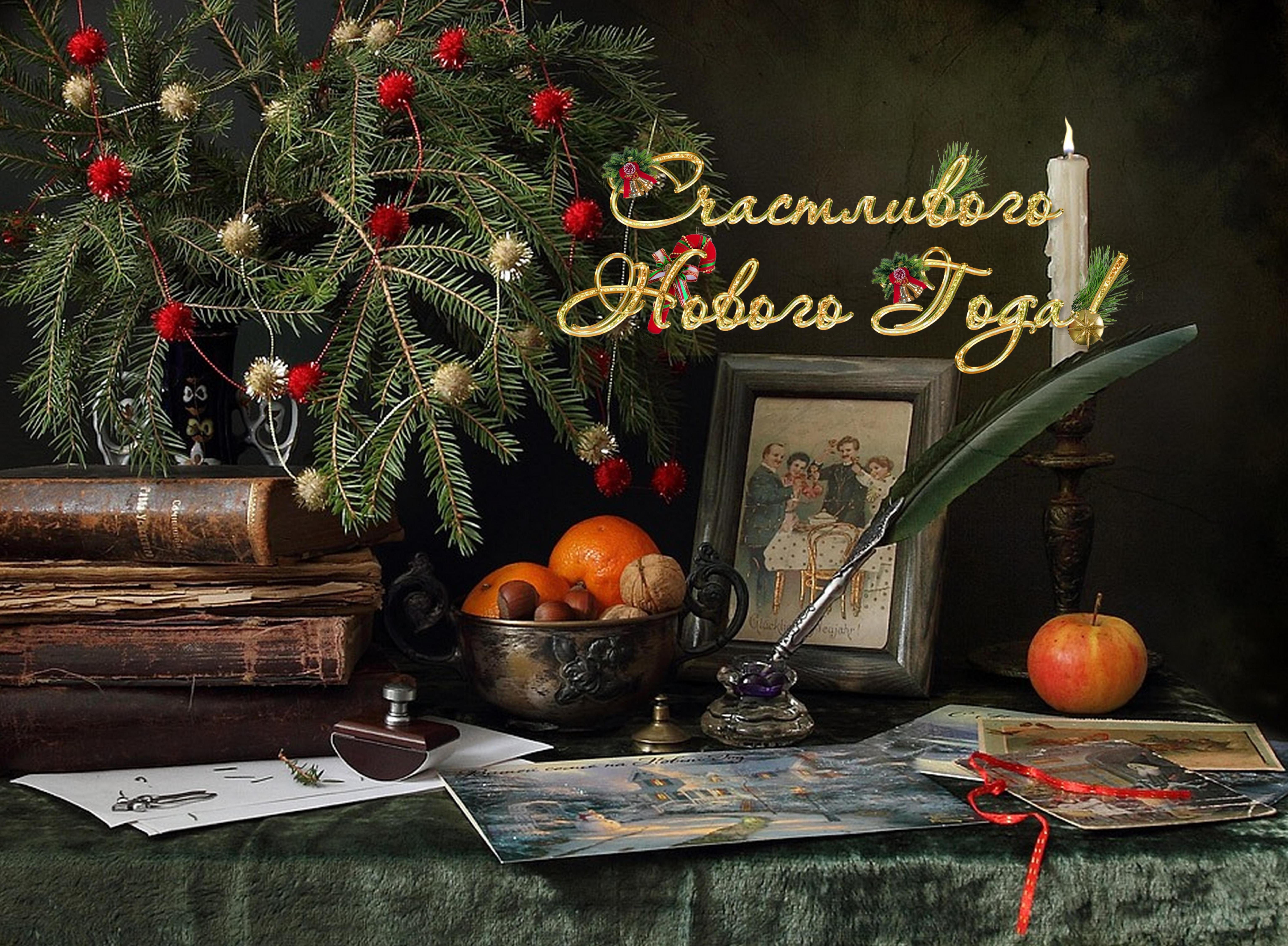 Восхитительная новогодняя открытка с изображением натюрморта привнесет волшебную атмосферу праздника в каждый дом. На фоне заснеженного пейзажа и теплого домашнего камина расположены разноцветные шары, блестящие елочные игрушки, сверкающие гирлянды и горящие свечи. Композиция выглядит так живописно, что словно можно услышать звон стекла и запах теплых праздничных блюд. Эта открытка станет прекрасным символом наступающего Нового года и подарит радость всем, кто ее увидит.