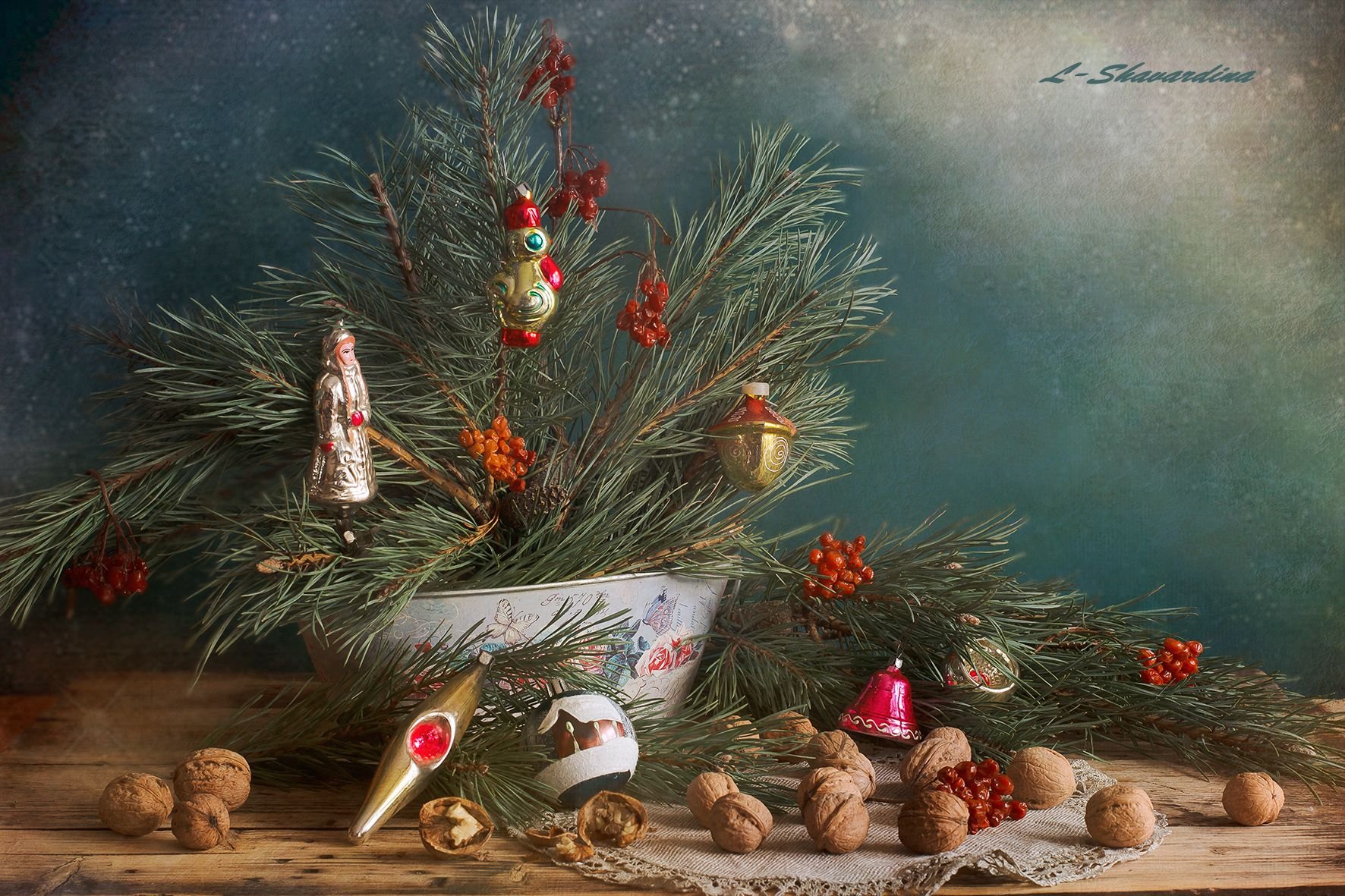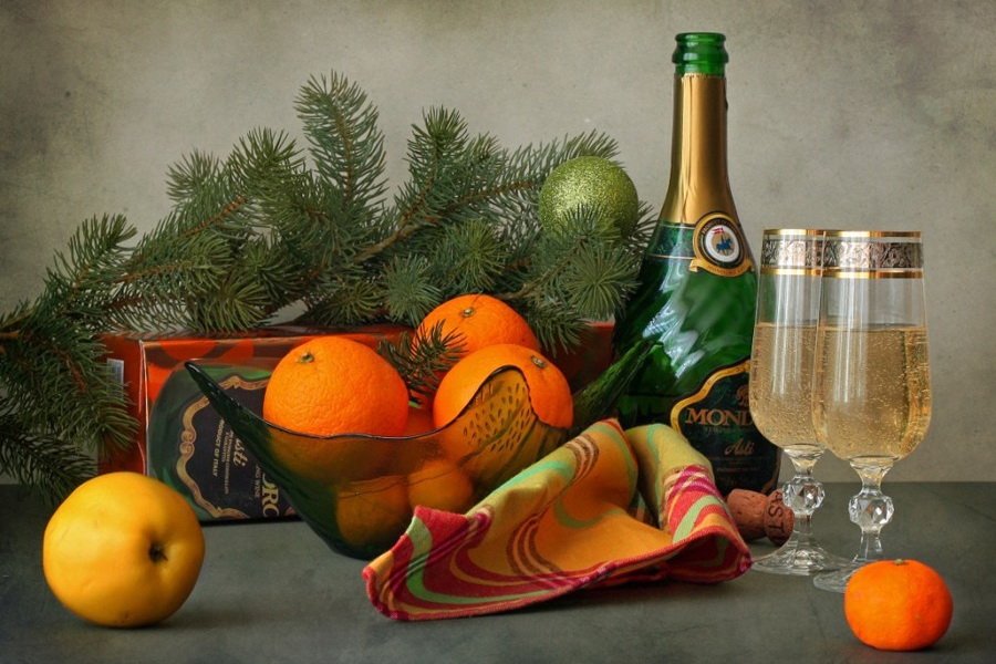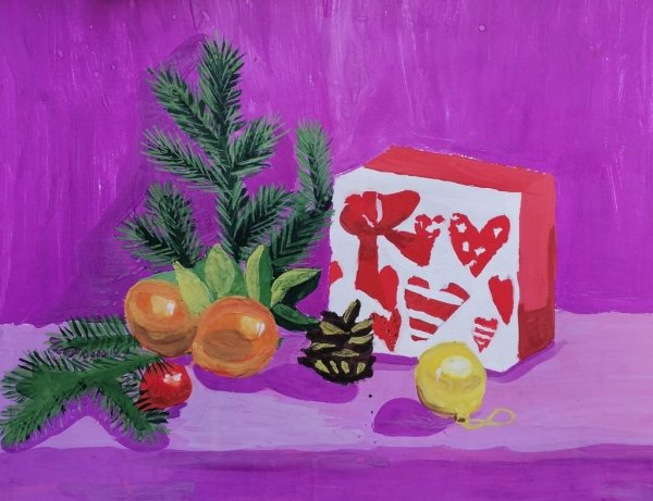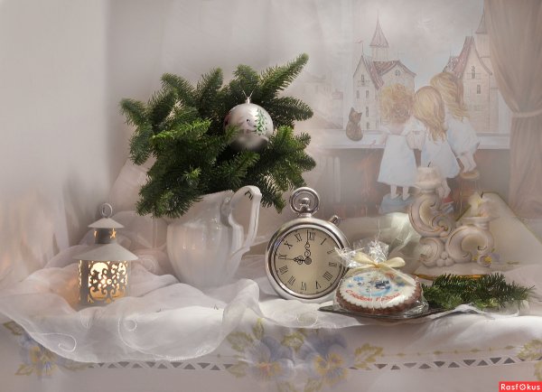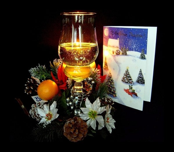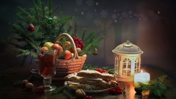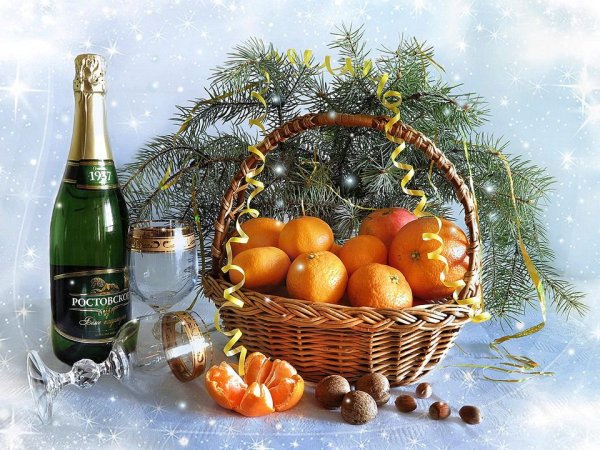 Восхитительная новогодняя открытка с изображением натюрморта привнесет волшебную атмосферу праздника в каждый дом. На фоне заснеженного пейзажа и теплого домашнего камина расположены разноцветные шары, блестящие елочные игрушки, сверкающие гирлянды и горящие свечи. Композиция выглядит так живописно, что словно можно услышать звон стекла и запах теплых праздничных блюд. Эта открытка станет прекрасным символом наступающего Нового года и подарит радость всем, кто ее увидит.