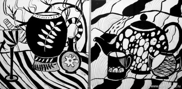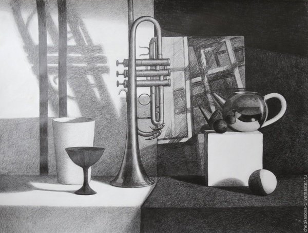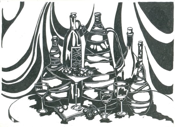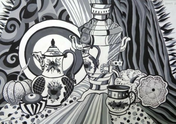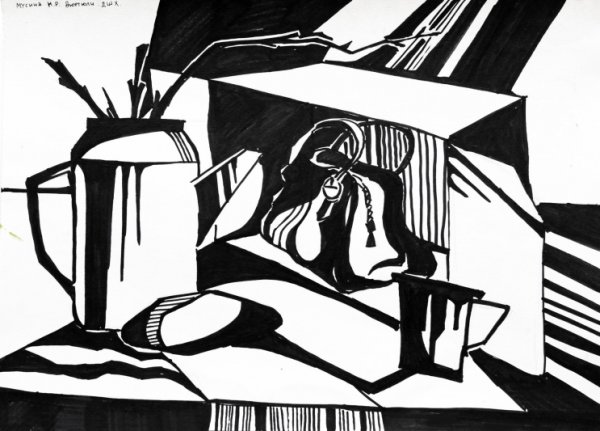 Графический натюрморт в черно-белой гамме - это произведение искусства, которое использует только оттенки серого, черного и белого для передачи изображения. Этот стиль создает эффект минимализма и абстракции, позволяя зрителю сосредоточиться на формах, линиях и текстуре объектов без отвлечения цветом. Черно-белый графический натюрморт может быть как реалистичным, с детальной проработкой каждого элемента, так и стилизованным, с использованием графических приемов и упрощенных форм. Такой вид искусства является уникальным способом выразить эмоции и интерпретировать окружающий мир через чистоту света и тени.