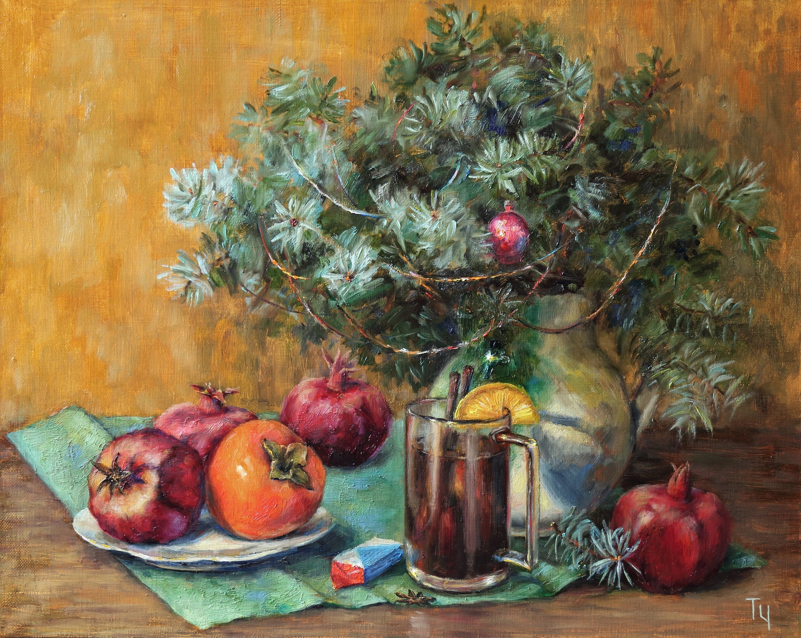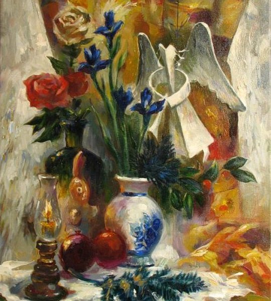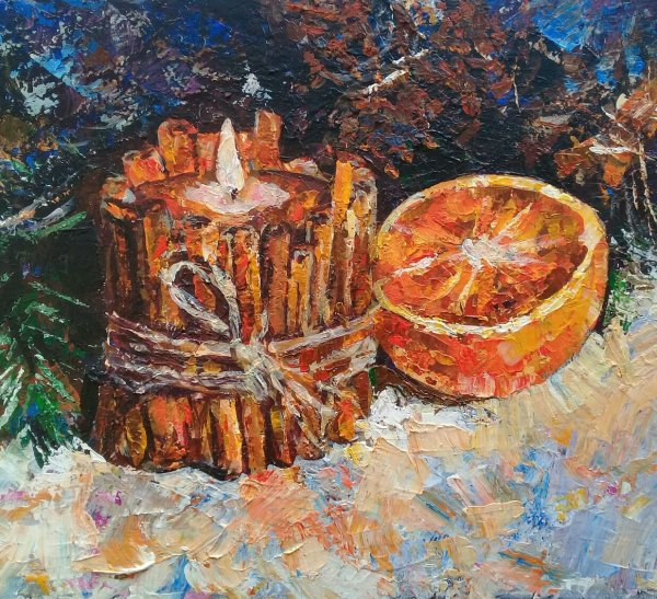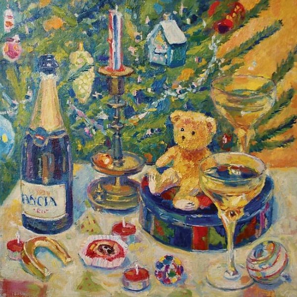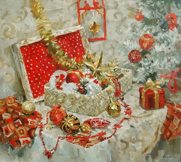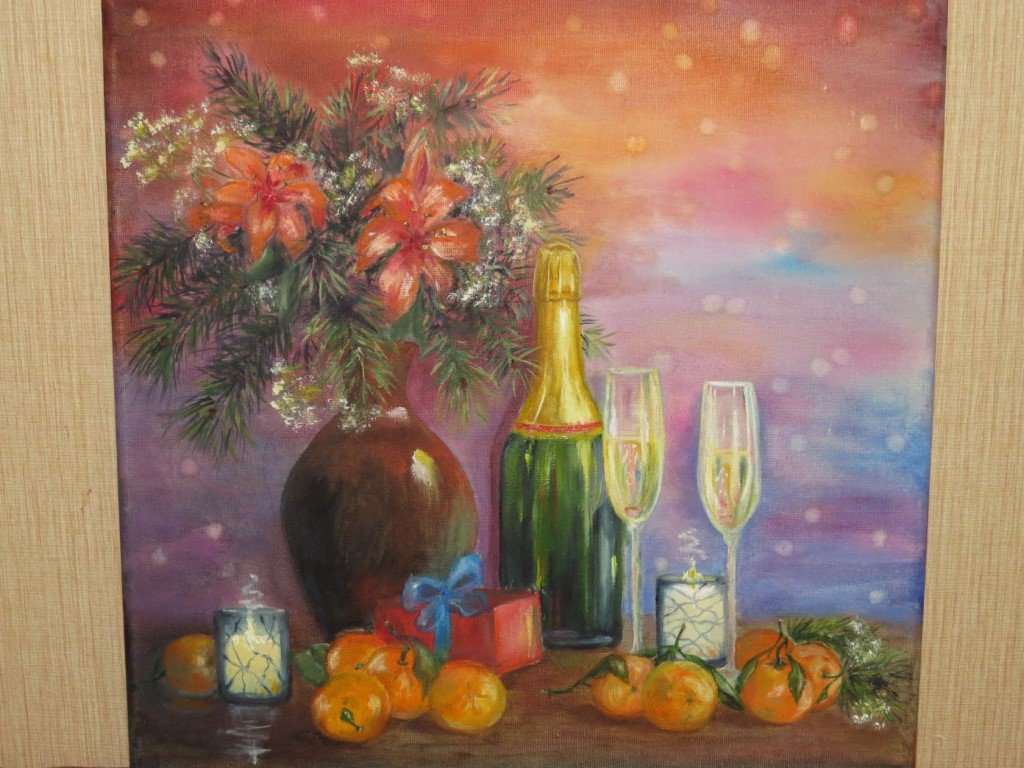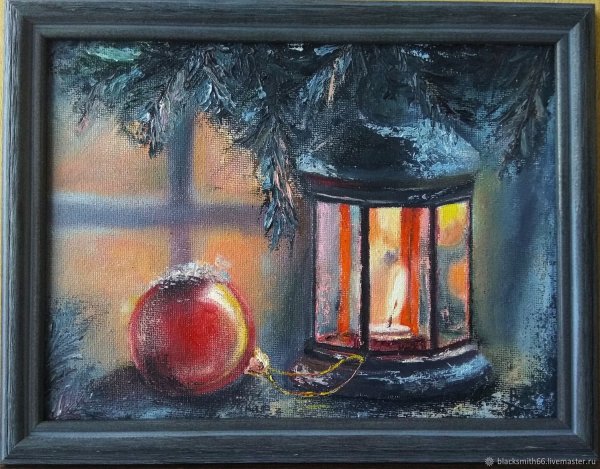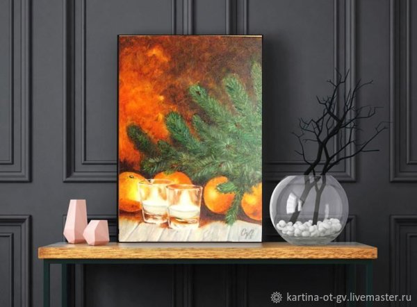 Новогодний натюрморт маслом на холсте переносит зрителя в атмосферу праздника и волшебства. Яркие краски и тонкие оттенки воплощаются в мастерски выполненных деталях, создавая ощущение живой картинки. Композиция наполнена символами новогодних традиций - гирлянды, елочные игрушки, сияющие свечи. Мягкое освещение подчеркивает каждую линию и форму, придающие работе объем и глубину. Такой натюрморт станет прекрасным украшением интерьера и привнесет праздничное настроение в любое помещение.