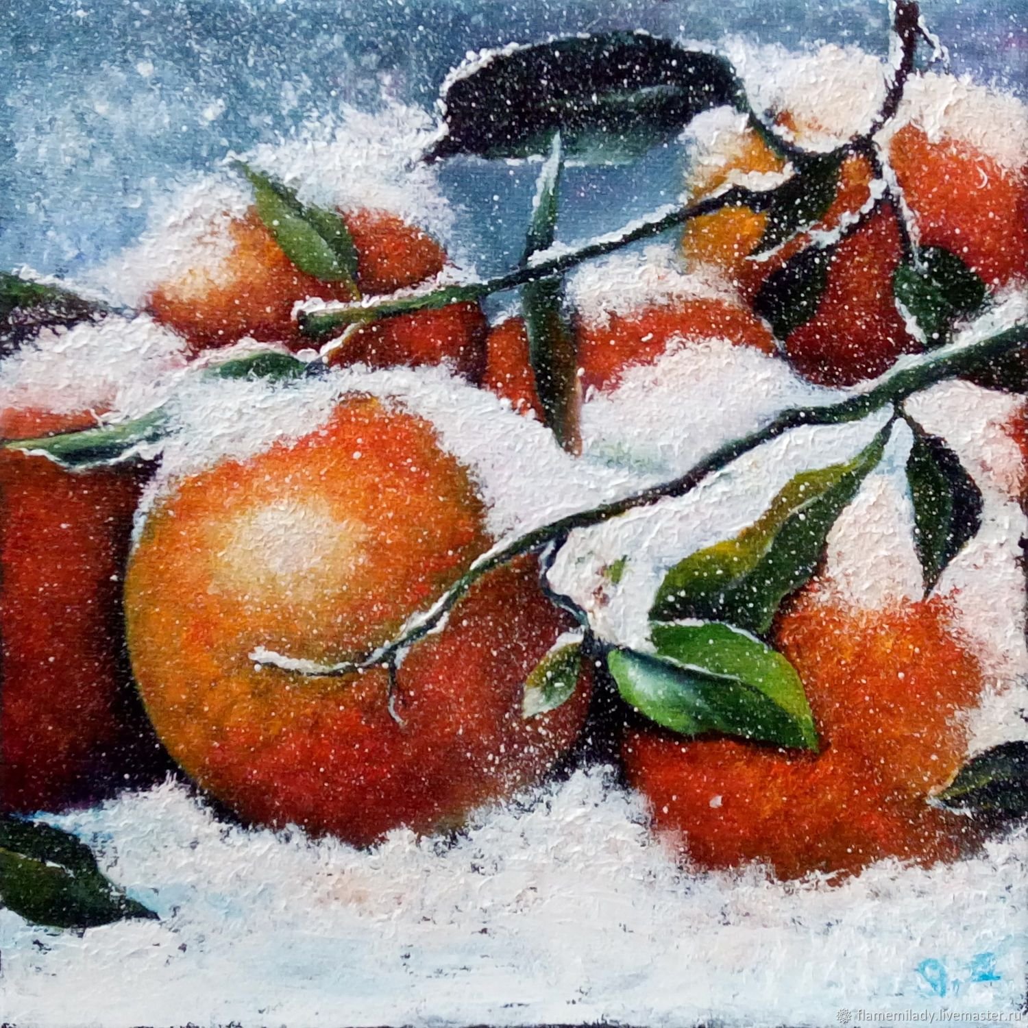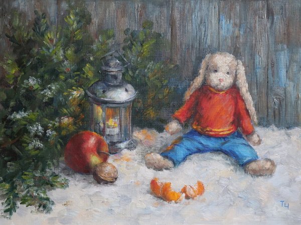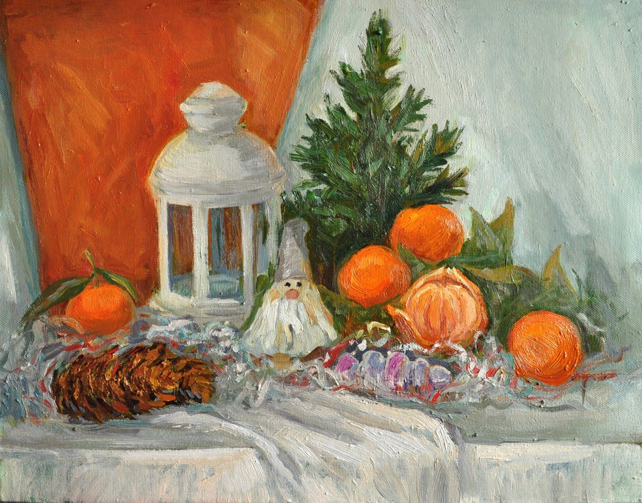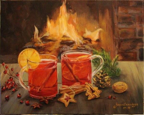 Новогодний натюрморт маслом на холсте переносит зрителя в атмосферу праздника и волшебства. Яркие краски и тонкие оттенки воплощаются в мастерски выполненных деталях, создавая ощущение живой картинки. Композиция наполнена символами новогодних традиций - гирлянды, елочные игрушки, сияющие свечи. Мягкое освещение подчеркивает каждую линию и форму, придающие работе объем и глубину. Такой натюрморт станет прекрасным украшением интерьера и привнесет праздничное настроение в любое помещение.