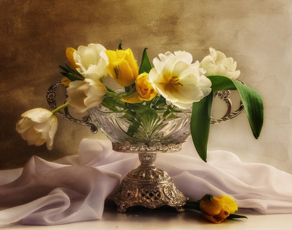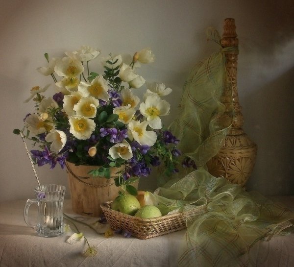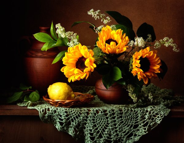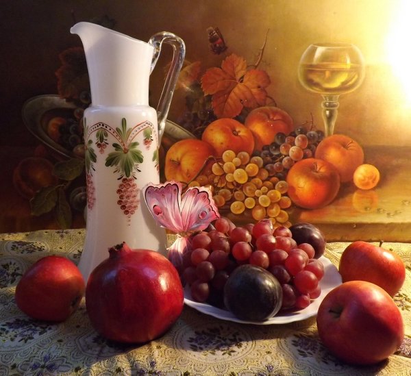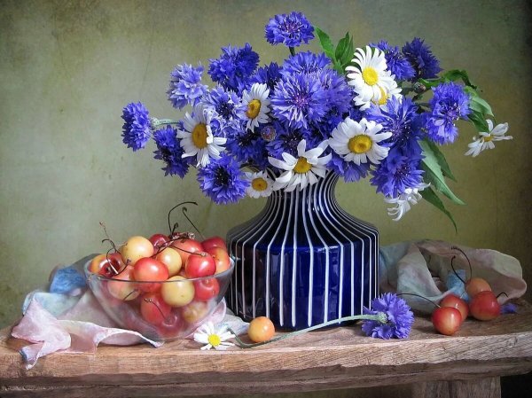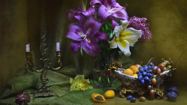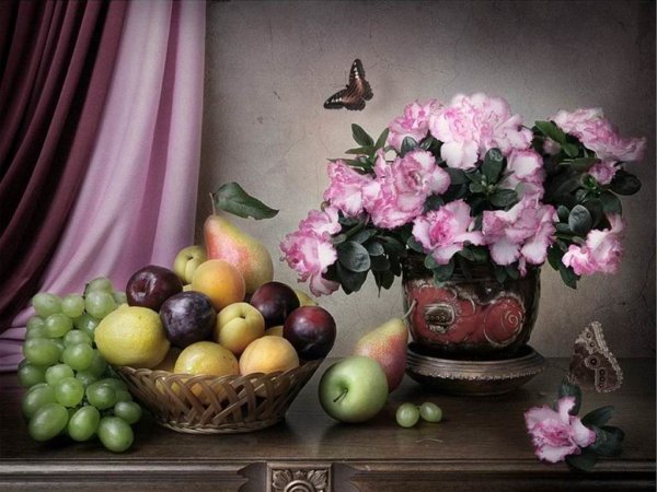 Волшебство природы воплощено в этом удивительном натюрморте, который с легкостью завораживает своей красотой. Он олицетворяет гармонию и изящество, являясь настоящим произведением искусства. Каждый элемент сцены – от цветов и фруктов до стеклянных предметов и тканей – благородно сплетается в единое целое, создавая впечатление живого присутствия. Реалистичные оттенки и тонкий переход между светом и тенью добавляют работе глубину и объем. Данный натюрморт не только радует глаз, но и позволяет окунуться в мир красоты и творчества.