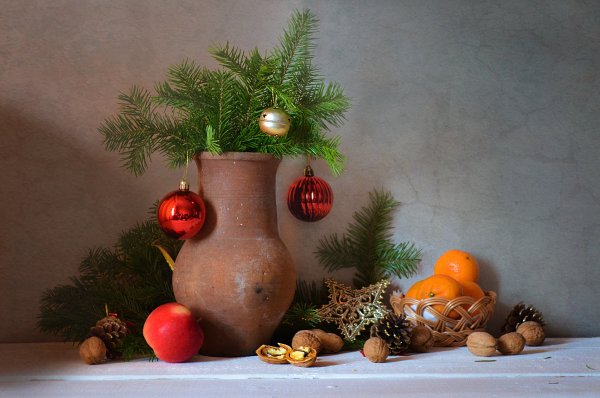 Великолепный натюрморт на тему Рождество привлекает внимание своей красотой и атмосферой праздника. На холсте изображены яркие и сочные фрукты, такие как яблоки, груши и мандарины, которые символизируют плодородие и изобилие. Они акцентируют внимание на богатстве и радости этого светлого времени года. В центре композиции расположена красиво украшенная елка с разноцветными гирляндами и фонариками, создающими атмосферу таинственности и ожидания. Натюрморт передает тепло и уют домашнего очага, наполняя сердца радостью и волнением перед предстоящим праздником. Это произведение искусства приглашает зрителя насладиться красотой Рождества и подарить ему частичку праздничной волшебной атмосферы.