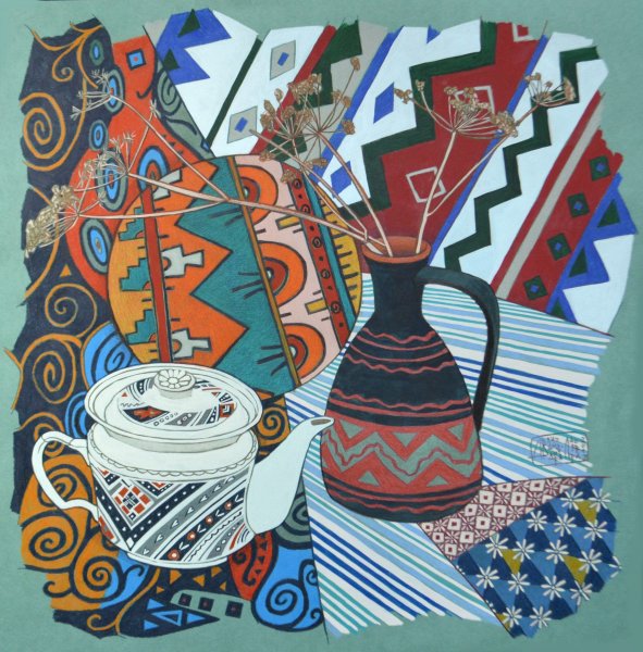 Декоративный натюрморт с орнаментом - это стильное и изысканное произведение искусства, которое привлекает внимание своим уникальным оформлением. Орнамент, являющийся главным акцентом данного натюрморта, придает ему особую изящность и элегантность. Каждая деталь орнамента великолепно проработана, создавая впечатление роскоши и ручной работы. Благодаря мастерству художника, этот декоративный натюрморт превращается в настоящее произведение искусства, способное украсить интерьер любого помещения и подарить ощущение гармонии и красоты.