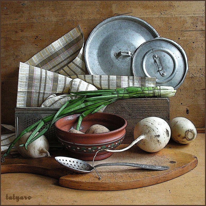 Представьте себе великолепный натюрморт, созданный из кухонных принадлежностей. В этом произведении искусства можно увидеть яркие цвета и разнообразные формы предметов, таких как кастрюли, сковородки, ножи, чашки и тарелки. Каждый элемент внес свой вклад в создание гармоничной композиции, придающей натюрморту особый шарм и уникальность. Различные текстуры, отражения и игра света добавляют глубину и реалистичность произведению. Натюрморт из кухонных принадлежностей олицетворяет домашнее уют и комфорт, и станет прекрасным дополнением интерьера вашей кухни или гостиной. Это искусство, которое позволяет насладиться простотой повседневных предметов, превращая их в объекты красоты и вдохновения.