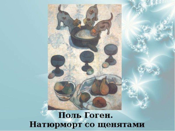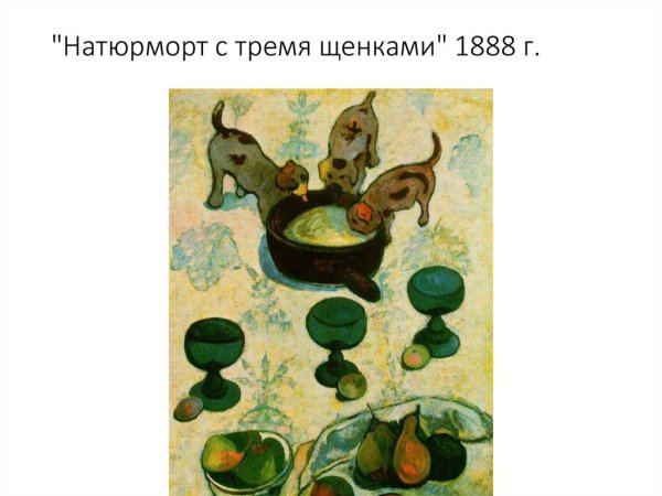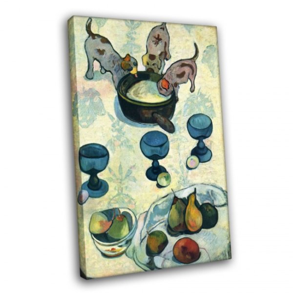 Натюрморт с тремя щенками - полотно, созданное известным французским художником Поль Гогеном. Эта картина великолепно передает живой и игривый характер трех маленьких щенков, которые размещены на столе в центре композиции. Благодаря своему таланту и мастерству, Гоген умело передает каждую деталь - от мягкой шерсти щенков до ярких, натуральных цветов, окружающих их. Картина переносит зрителя в атмосферу радости и беззаботности, вызывая улыбку на его лице. Это произведение идеально подойдет для тех, кто любит живопись и природу, а также для тех, кто хочет добавить нотку игривости и радости в свое интерьерное решение.