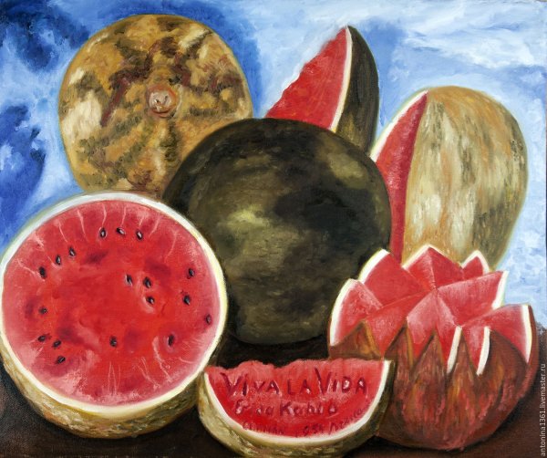 Натюрморт с арбузами - это знаменитая картина Мексиканской художницы Фриды Кало. В этом произведении искусства она изобразила два сочных арбуза, разрезанных пополам, размещенных на столе. Картина полна ярких цветов и деталей, которые привлекают внимание зрителя. Фрида Кало использовала свою характерную манеру рисования, смешивая различные стили и элементы, чтобы передать свои эмоции и мысли. "Натюрморт с арбузами" отражает темы природы, жизни и смерти, обычно присутствующие в работах Кало. Это произведение искусства является одним из самых известных натюрмортов художницы и до сих пор восхищает своей красотой и символическим значением.