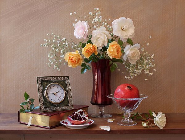 Натюрморт - это живописная композиция, в которой изображены неживые предметы, такие как фрукты, цветы, посуда или другие объекты. Он позволяет художнику передать красоту и гармонию различных элементов, а также играть с светом, тенями и текстурой. Время, в данном контексте, может быть интерпретировано как абстрактное понятие, которое добавляет глубину и символическое значение к произведению. Через натюрморт художники могут увековечить момент во времени, запечатлеть его красоту и эмоции. В результате получается работа, которая может вызвать размышления и привлечь внимание зрителей своей уникальностью и оригинальностью.