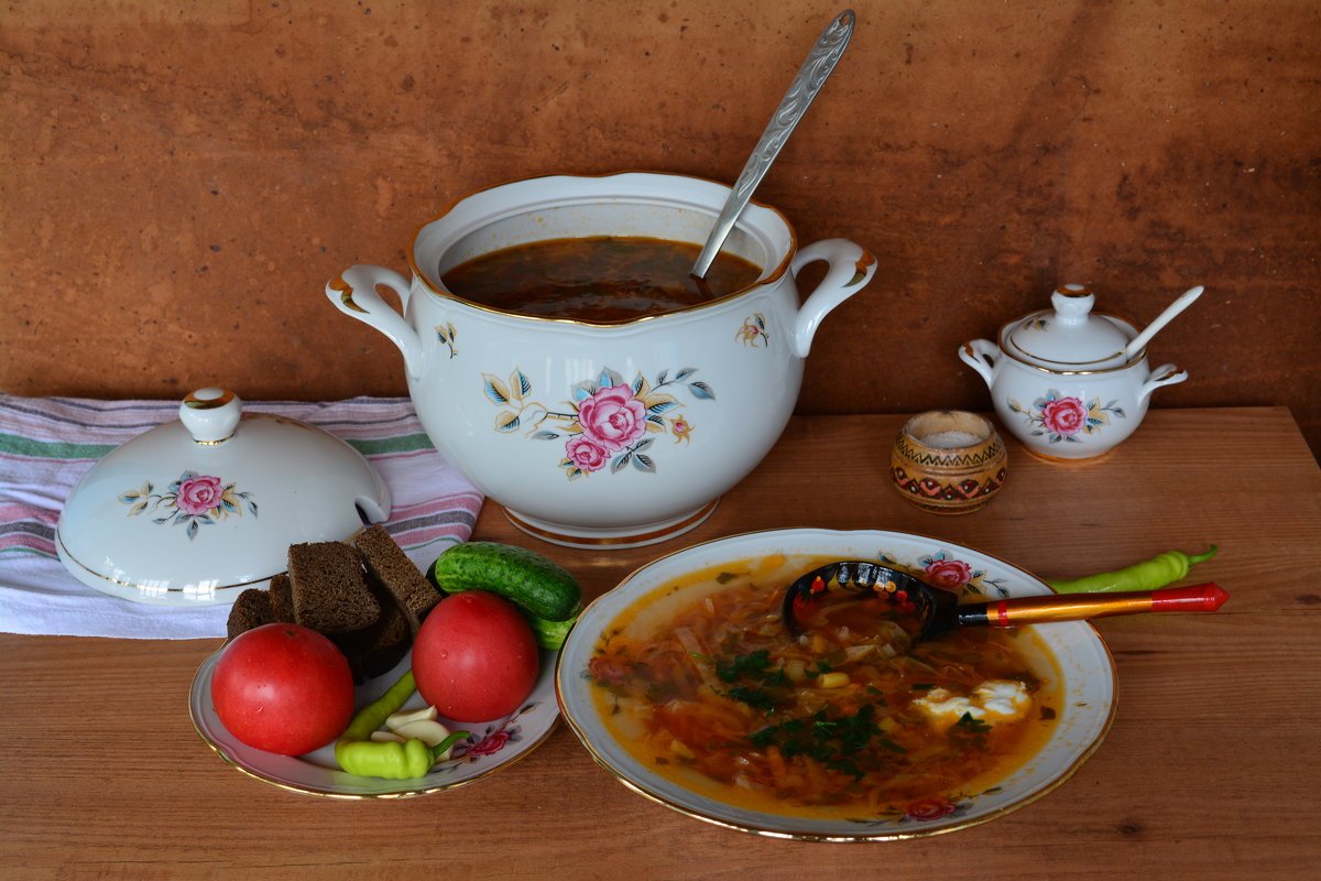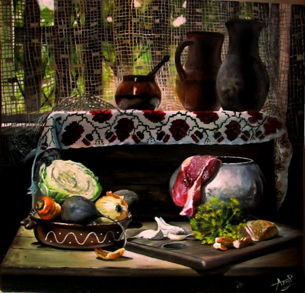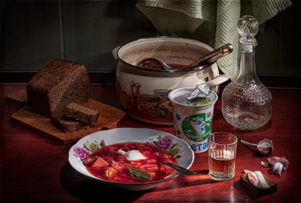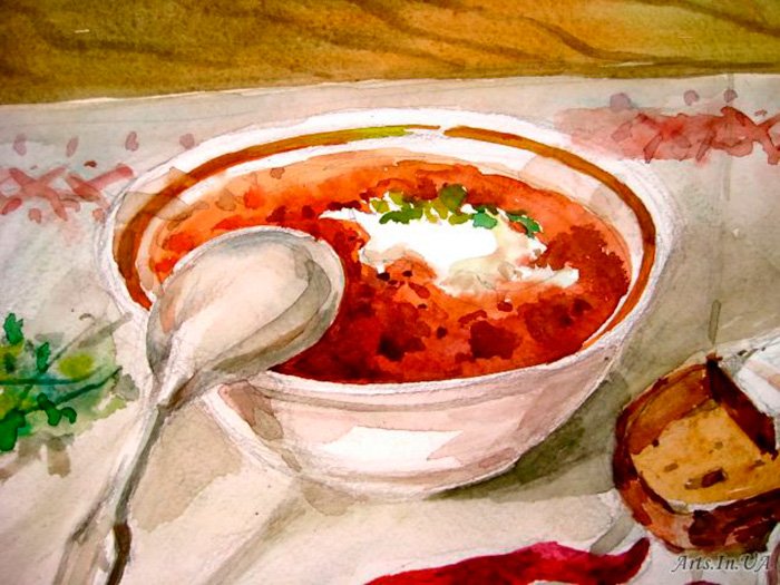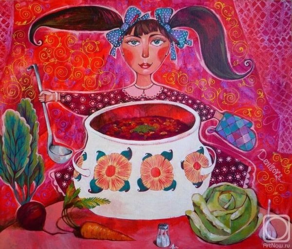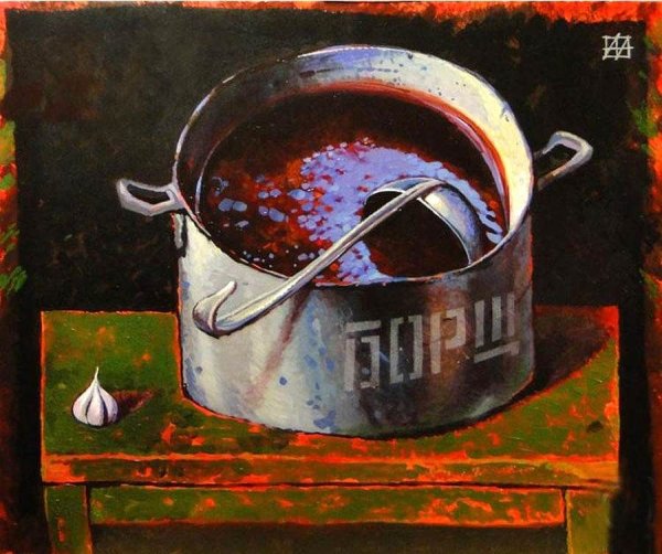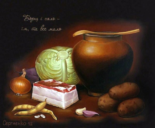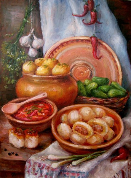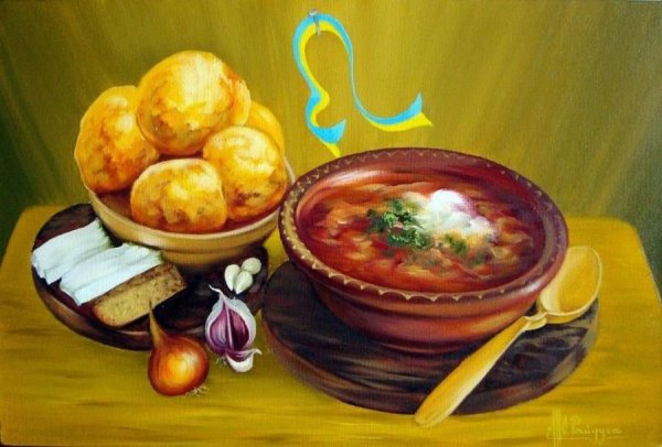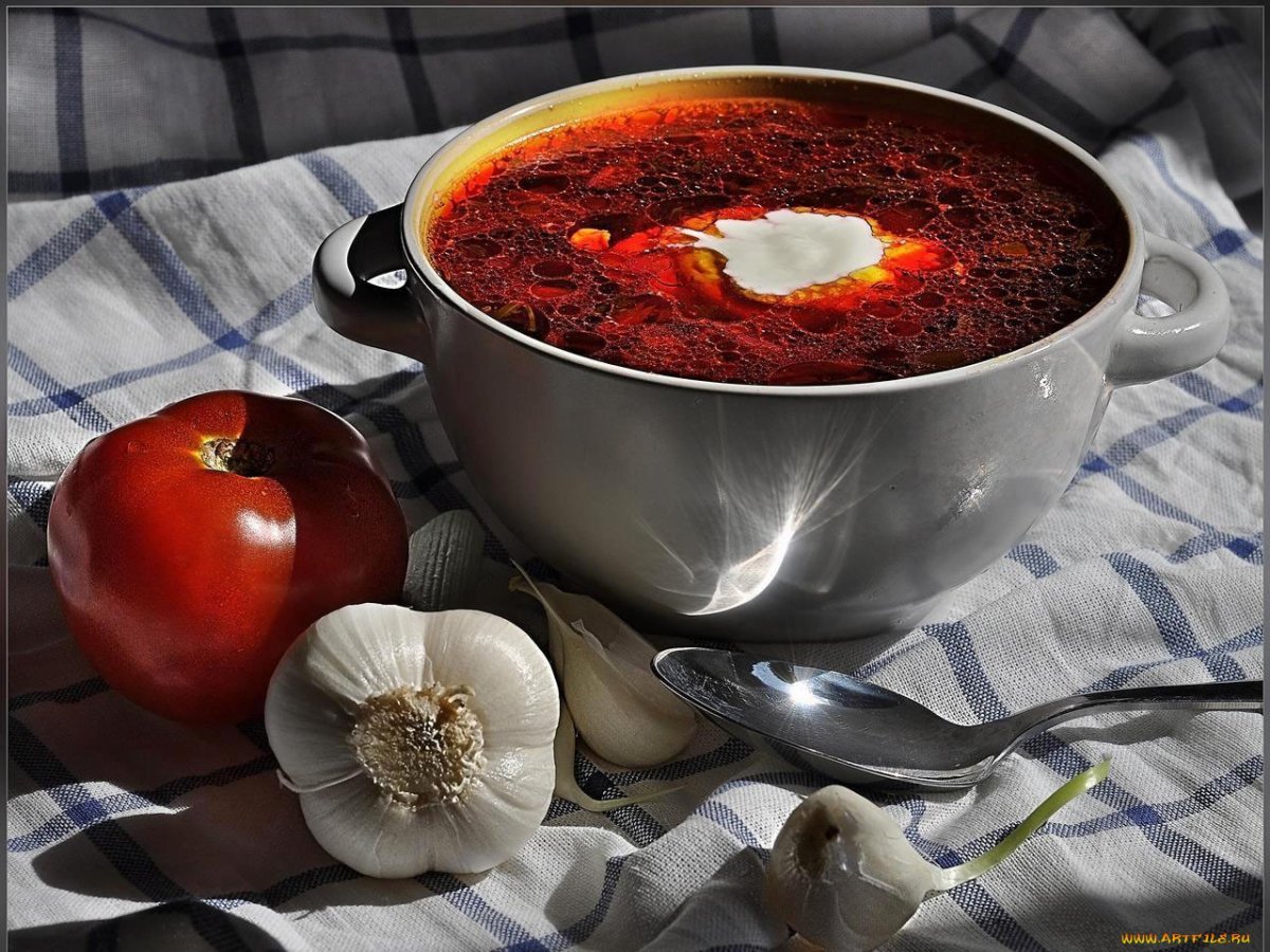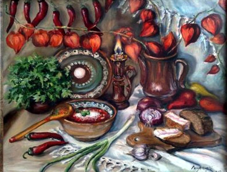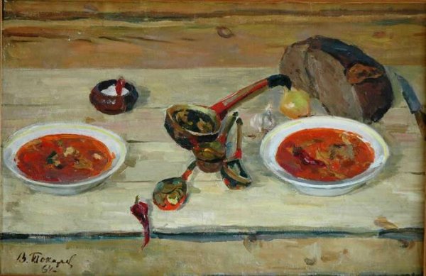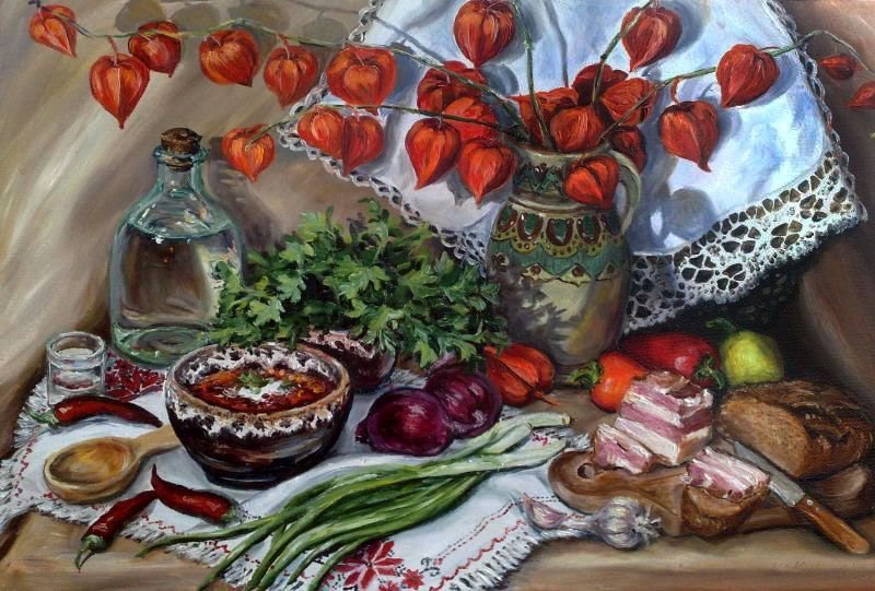 Натюрморт "борщ" - это живописное изображение классического украинского блюда, состоящего из свеклы, мяса, картофеля, лука и других овощей. В этом натюрморте можно увидеть яркую палитру цветов: красный от свеклы, зеленый от укропа и зелени, белый от сметаны. Каждая деталь находится на своем месте, создавая гармоничную композицию. Это изображение воплощает традиции и наследие украинской кухни, передавая ее аутентичность и вкус. Натюрморт "борщ" может быть отличным украшением для кухни или ресторана, а также вдохновить на приготовление этого вкусного и питательного блюда.