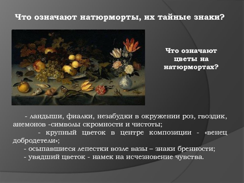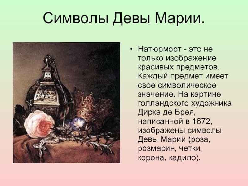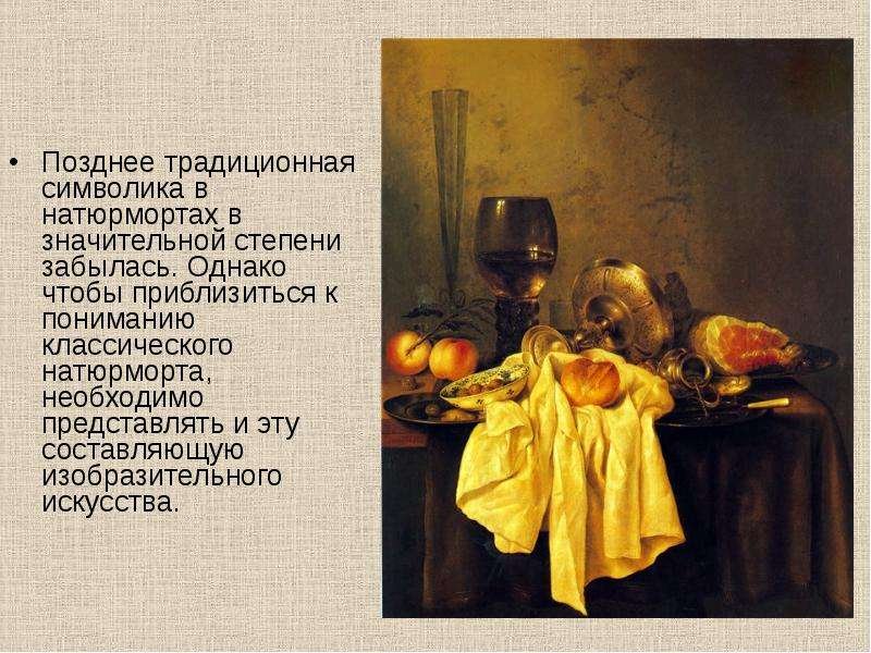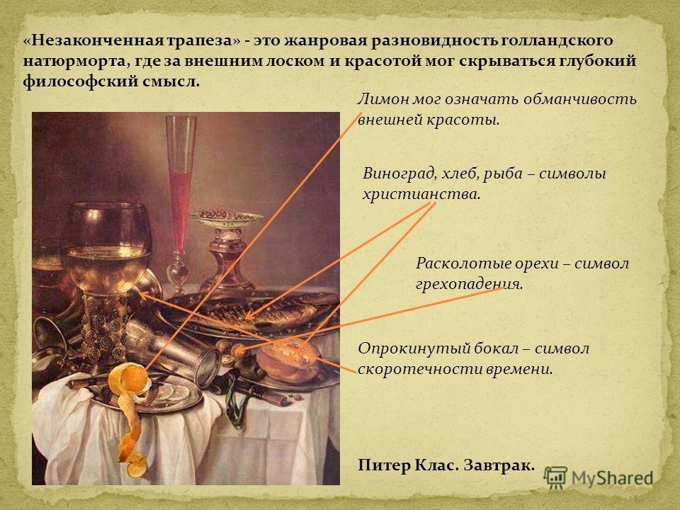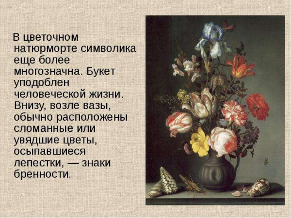 Символика в натюрморте - это мощный инструмент, используемый художниками для передачи определенного смысла и настроения через изображение различных объектов. Каждый элемент на натюрморте может нести свою символическую нагрузку и передавать определенные эмоции и идеи. Например, цветы могут символизировать красоту, жизнь и увядание, фрукты - плодородие и обильность, а скелеты или мертвые предметы - смерть и тлен. Через сочетание разных объектов и цветовых решений художник может создавать глубокий смысл и вызывать эмоциональное отклик у зрителя, делая натюрморт не просто изображением предметов, но и символическим произведением искусства.