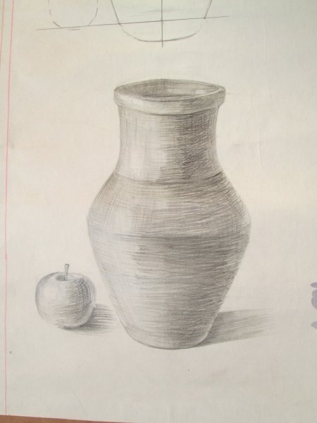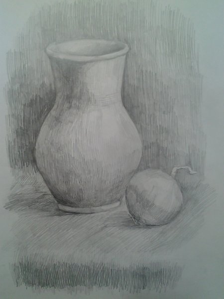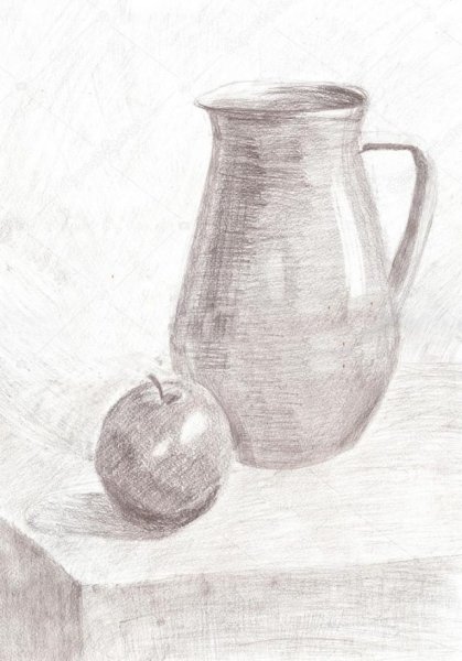 Великолепный натюрморт, нарисованный карандашом, захватывает взгляд своей простотой и изяществом. В центре композиции расположена элегантная ваза, изображенная с большой детализацией и точностью. Ее изысканные контуры и фактура придают ей особую грацию и шарм. Рядом с вазой лежит яркое и аппетитное яблоко, которое является не только символом жизни и плодородия, но и прекрасно подчеркивает насыщенность цветовой гаммы произведения. Каждая черта и тень, каждый вьющийся листочек и блеск отражений создают глубину и объем, оживляя картину перед глазами зрителя. Этот натюрморт способен перенести нас в мир тихой гармонии и умиротворения, позволяя насладиться простотой и красотой повседневных вещей.