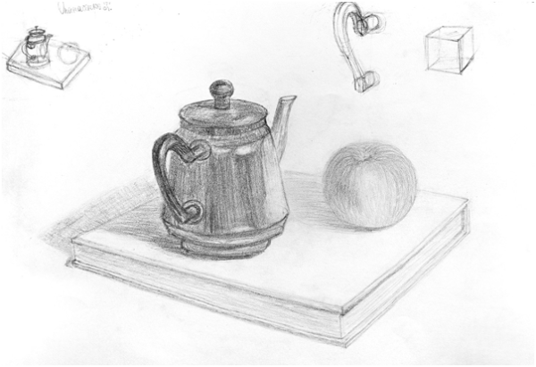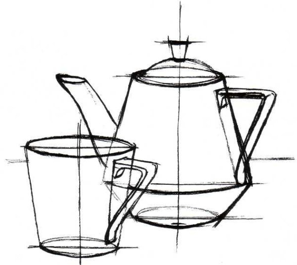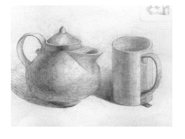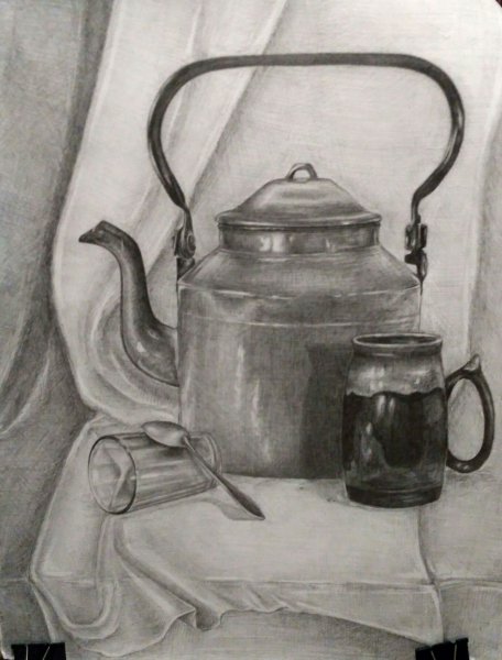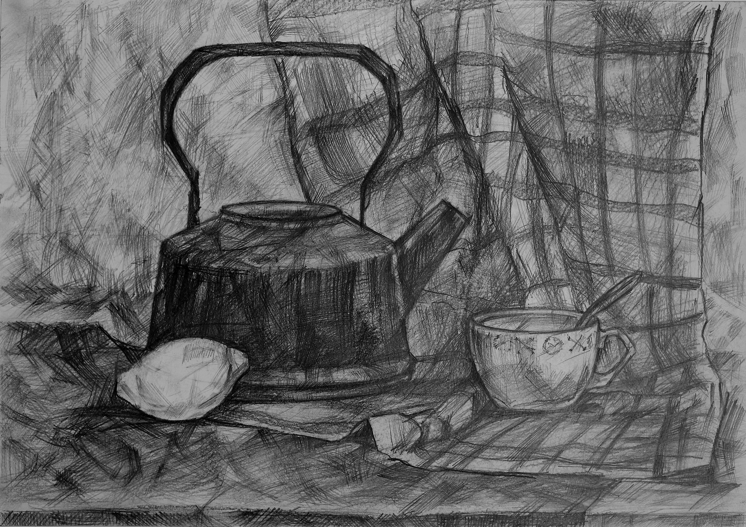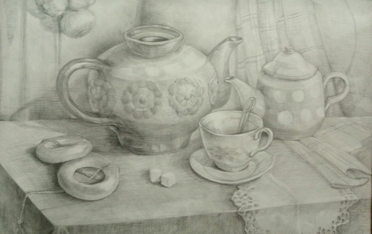 Великолепный натюрморт, изображающий чайник и чашку, выполненный с помощью мастерского карандашного наброска, впечатляет своей реалистичностью и детализацией. Каждая линия и тень аккуратно проработаны, создавая ощущение глубины и объема предметов на бумаге. Отточенные детали чайника и чашки передают их текстуру и форму, а также добавляют эффект отражения света. Такой натюрморт настолько живописен, что можно почувствовать запах свежесваренного чая и ощутить тепло в горячей чашке. Работа искусства, вдохновленная обыденными предметами, подчеркивает красоту простоты и приглашает зрителя насладиться моментом покоя и умиротворения.