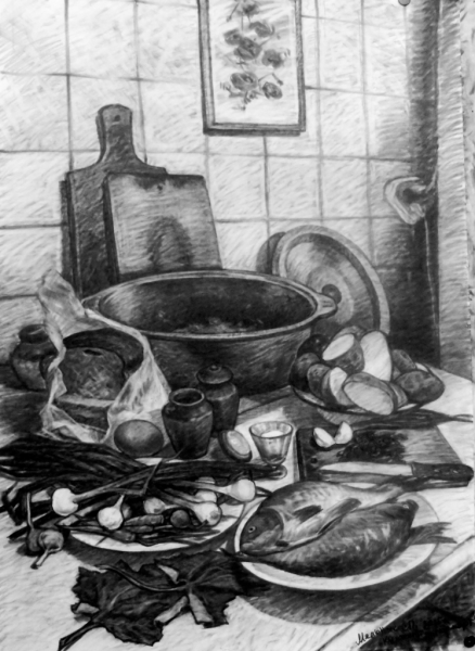Кухонный натюрморт, выполненный карандашом, это произведение искусства, которое заставляет зрителей задуматься о простоте и красоте повседневных предметов. Каждая линия и тень, созданные мастерским ходом карандаша, передают реалистичность и детализацию предметов, таких как фрукты, овощи, посуда и кухонные принадлежности. Видя эти объекты на бумаге, зритель может почувствовать атмосферу кухни и пережить ощущения запахов и вкусов, свойственных этому пространству. Натюрморт кухонным карандашом - это искусство, объединяющее реализм и эстетику, и является прекрасным способом выразить красоту и функциональность кухонных предметов через искусство рисунка.