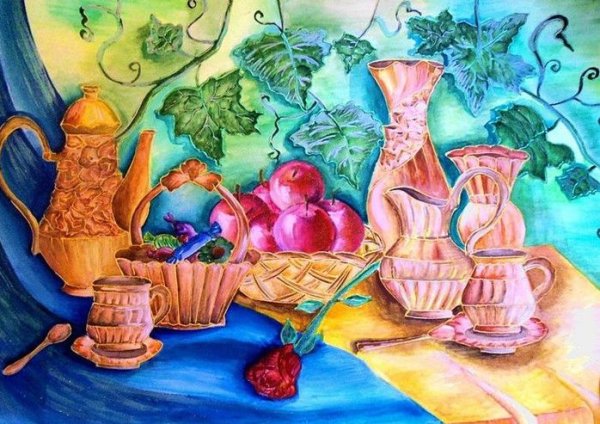 Представьте себе прекрасный натюрморт, в котором главным героем выступает изысканный чайный сервиз. Рисунок на каждой детали сервиза ярко и красочно передает его элегантность и изысканность. Эта композиция приносит ощущение уюта и спокойствия, создавая атмосферу для наслаждения чашечкой душистого чая. Каждая чашка и блюдце, каждый чайник и сахарница предстают перед нами с невероятной детализацией и нежностью, заставляя нас полностью погрузиться в мир чая и расслабления. Натюрморт чайного сервиза с рисунком станет прекрасным элементом декора для вашего дома или подарком для любителей чая.