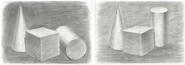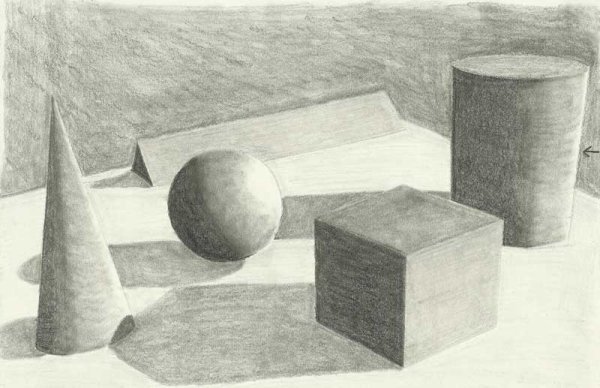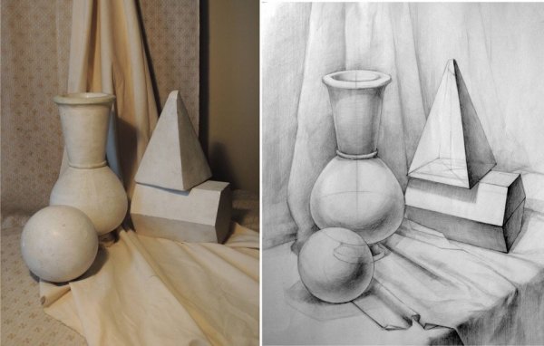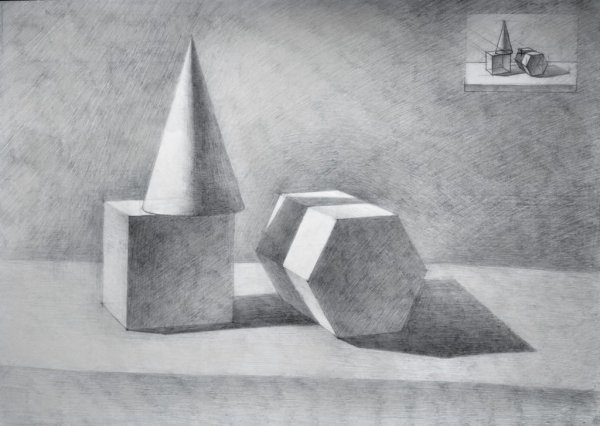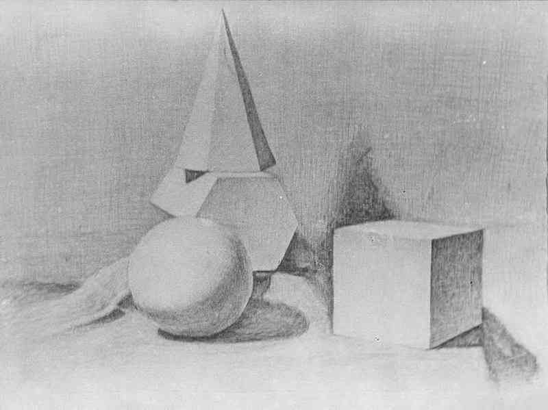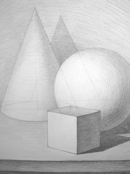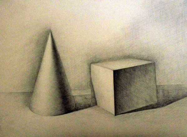Натюрморт "Куб и конус карандашом" - это изображение, созданное с помощью техники рисования карандашом. В центре композиции находятся два геометрических объекта - куб и конус. Каждая деталь отображена с пристальной точностью и вниманием к деталям, что придает работе реалистичность и объемность. Конус расположен над кубом, создавая игру света и тени и добавляя глубину к картине. Художник умело передает текстуру и форму каждого объекта, используя различные оттенки и тонировки карандашных штрихов. Это произведение искусства вызывает интерес и восхищение своей мастерской выполненностью и детализацией.