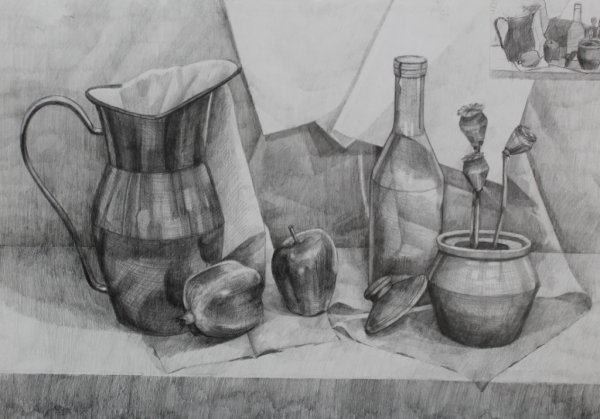 Рисунок натюрморта в серых тонах - это прекрасное произведение искусства, которое передает особую атмосферу и настоящую глубину. Серые тона придают ему нежность и таинственность, создавая эффект погружения в мир безмятежности и спокойствия. В этом рисунке каждая деталь, каждый объект внимательно изображен с помощью точных линий и тоновых переходов, что придает работе объем и реалистичность. В центре внимания могут быть различные предметы, например, фрукты или цветы, которые благодаря использованию серых оттенков приобретают особую грацию и стиль. Такой натюрморт подходит как для интерьера, создавая уютную атмосферу, так и для любителей искусства, которые ценят уникальность и оригинальность. Рисунок натюрморта в серых тонах является прекрасным дополнением к любому интерьеру и вызывает чувство гармонии и спокойствия.