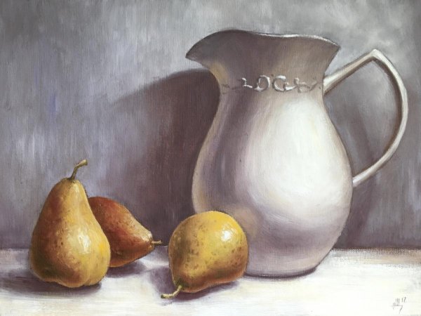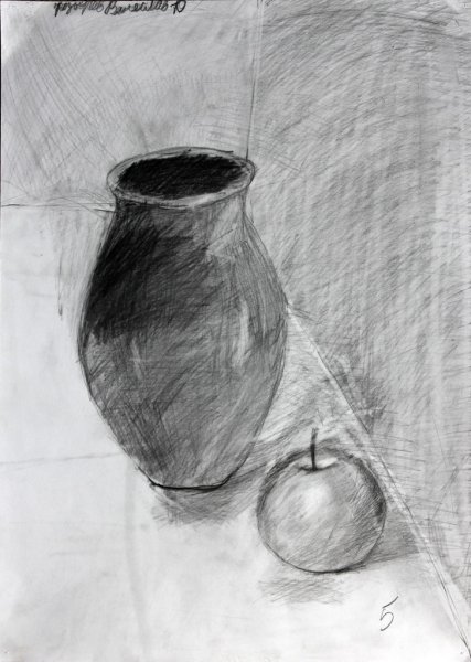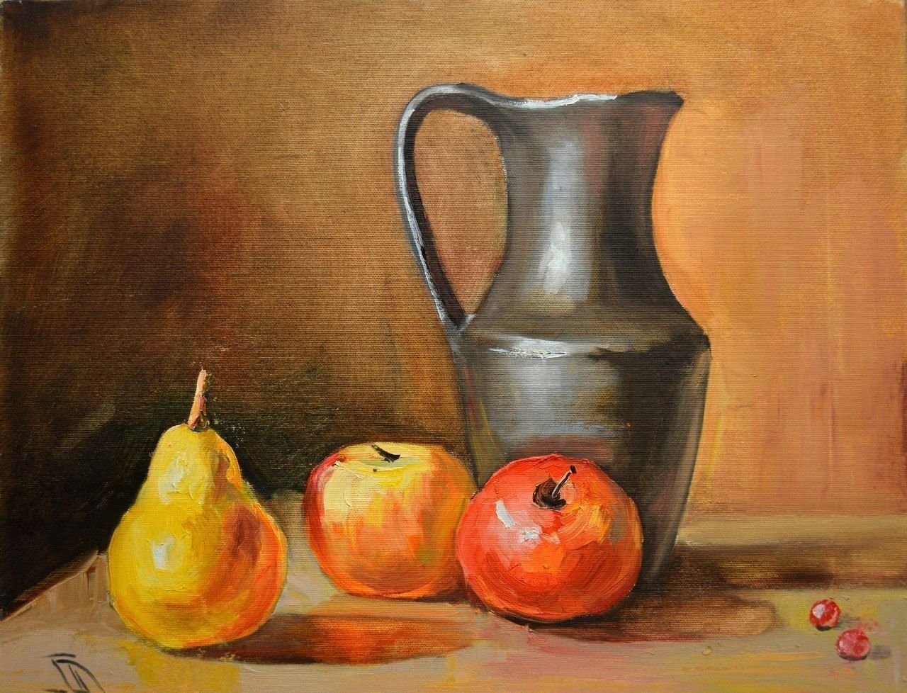 Великолепный натюрморт, воплощенный на холсте - это композиция из ярко-красного яблока, изящного кувшина и сочной зеленой груши. Каждая деталь этого произведения искусства прорисована с удивительной точностью и мастерством. Яблоко выглядит так реалистично, что хочется протянуть руку и потрогать его гладкую поверхность. Кувшин излучает благородство и изысканность своей формой и узорами, а груша добавляет свежести и жизненности всей композиции. Это настоящее произведение искусства, которое вызывает восхищение и впечатляет своей уникальностью. Работа выполнена с использованием карандаша, что придает ей особую тонкость и глубину. Этот натюрморт станет украшением любого интерьера и запомнится каждому, кто увидит его.