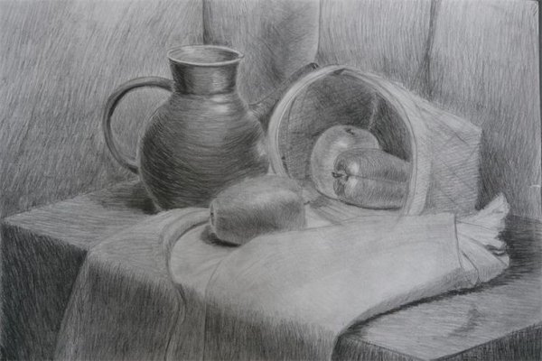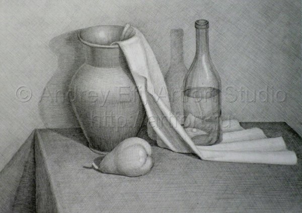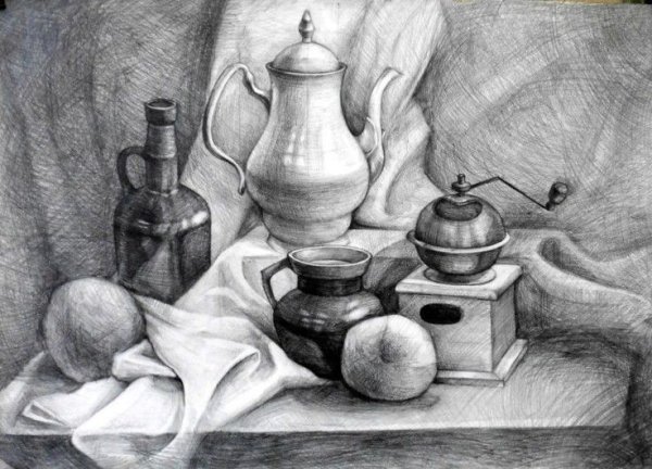Наш натюрморт контрастным карандашом поражает своей глубиной и реалистичностью. Каждая линия, тень и деталь тщательно проработаны, создавая эффект трехмерности и ощущение реального объекта перед нами. Контрастные переходы между светлыми и темными областями придают работе особую живость и динамизм. Карандашные штрихи точно передают текстуру каждого предмета на натюрморте, отражая их плавные формы или грубые поверхности. Это произведение искусства воплощает мастерство художника и его способность заставить зрителя почувствовать всю глубину и богатство мира через черно-белый тон.