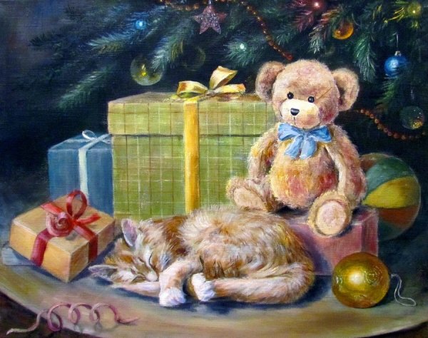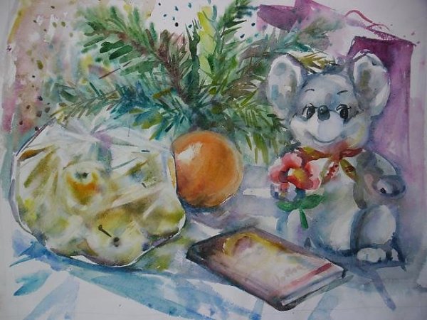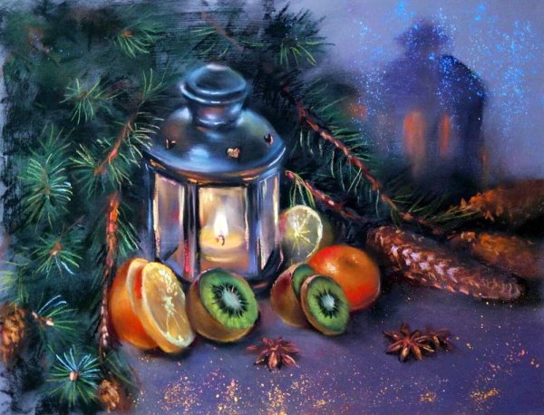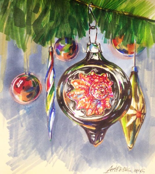 Натюрморт с новогодними игрушками - это очаровательный рисунок, который переносит нас в мир праздника и волшебства. На нем изображены разноцветные и блестящие игрушки, которые создают атмосферу радости и ожидания. Каждая игрушка имеет свой уникальный дизайн - от классических шаров до забавных фигурок снеговиков и оленей. С ними гармонично сочетается зеленая елка и гирлянды, создавая прекрасное сочетание цветов и форм. Этот натюрморт является прекрасным украшением для интерьера во время новогодних праздников, а также может стать прекрасным подарком для любителей искусства и праздника.