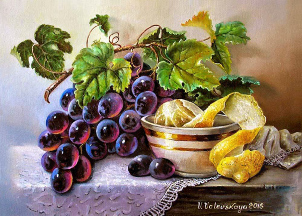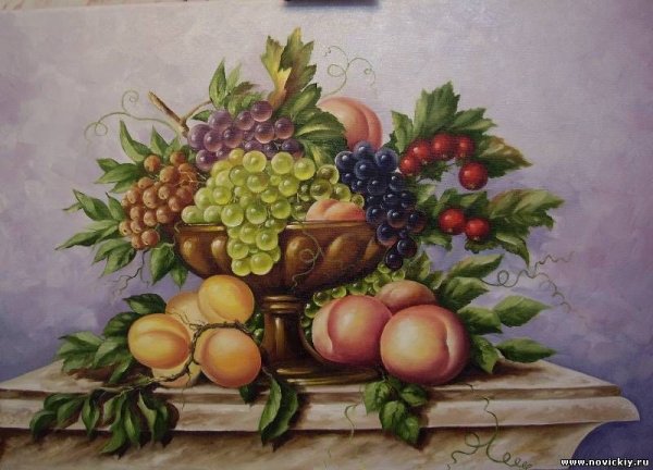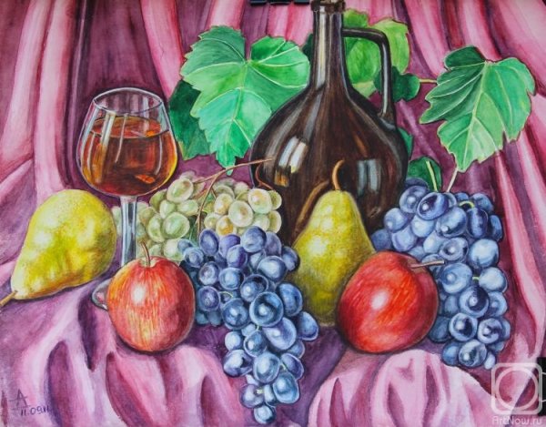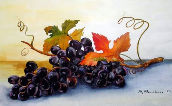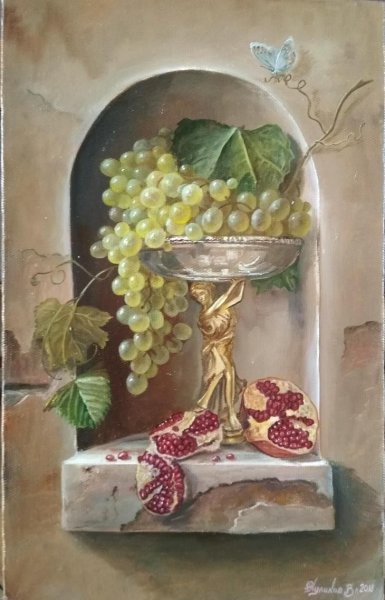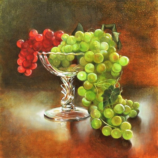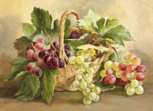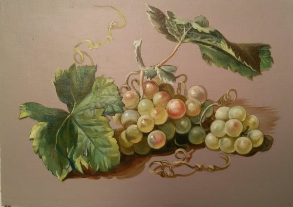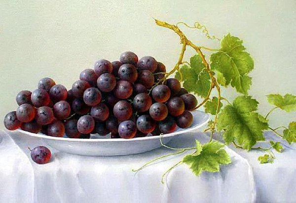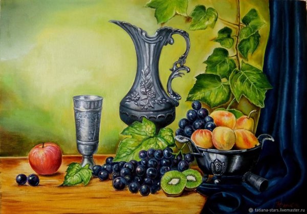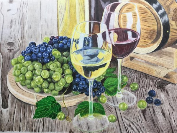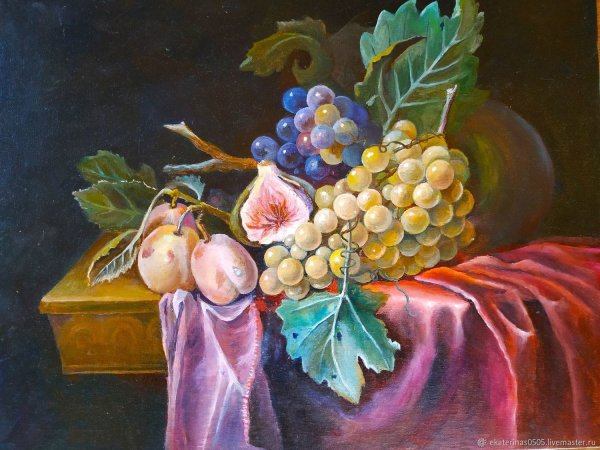 Натюрморт с виноградом - это живописный рисунок, который воплощает красоту и изящество этого ягодного плода. В центре композиции расположены сочные, блестящие грозди винограда разных оттенков: от светло-зеленых до темно-фиолетовых. Художник смог передать каждый деталь ягоды - ее форму, текстуру и блеск на поверхности. Задний план натюрморта оформлен тонкими листьями виноградной лозы, придающими работе естественность и жизнерадостность. Комбинация ярких цветов и мастерство художника создают атмосферу изобилия и праздника. Этот рисунок подойдет для украшения интерьера кухни, столовой или винной комнаты, добавляя в них изысканности и элегантности.