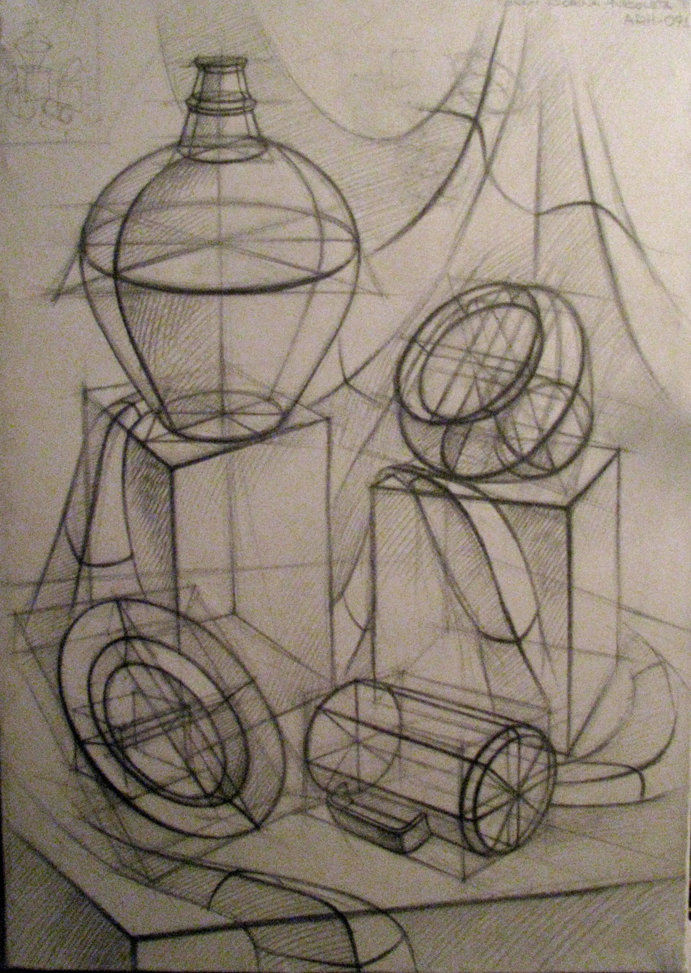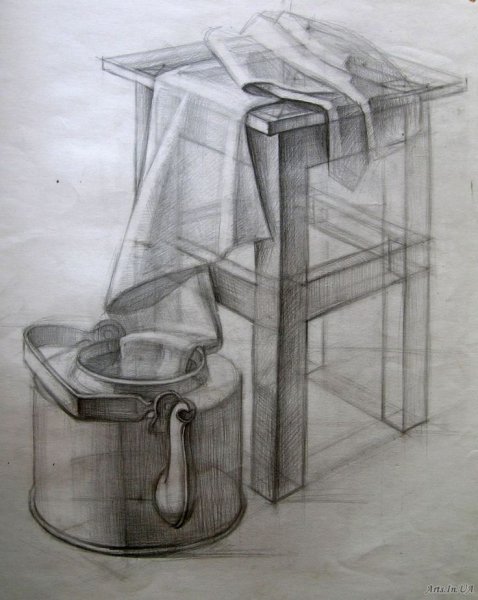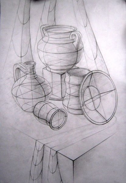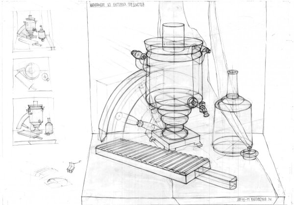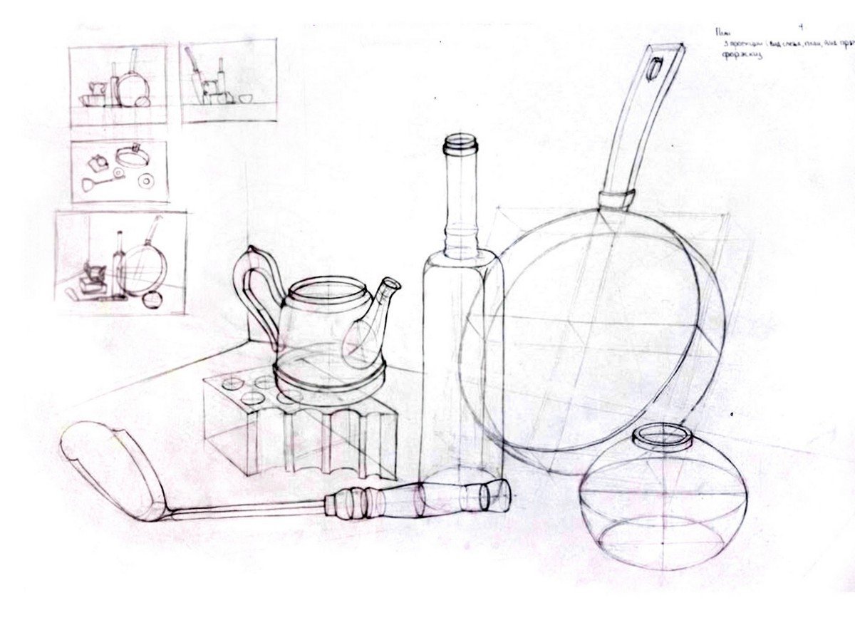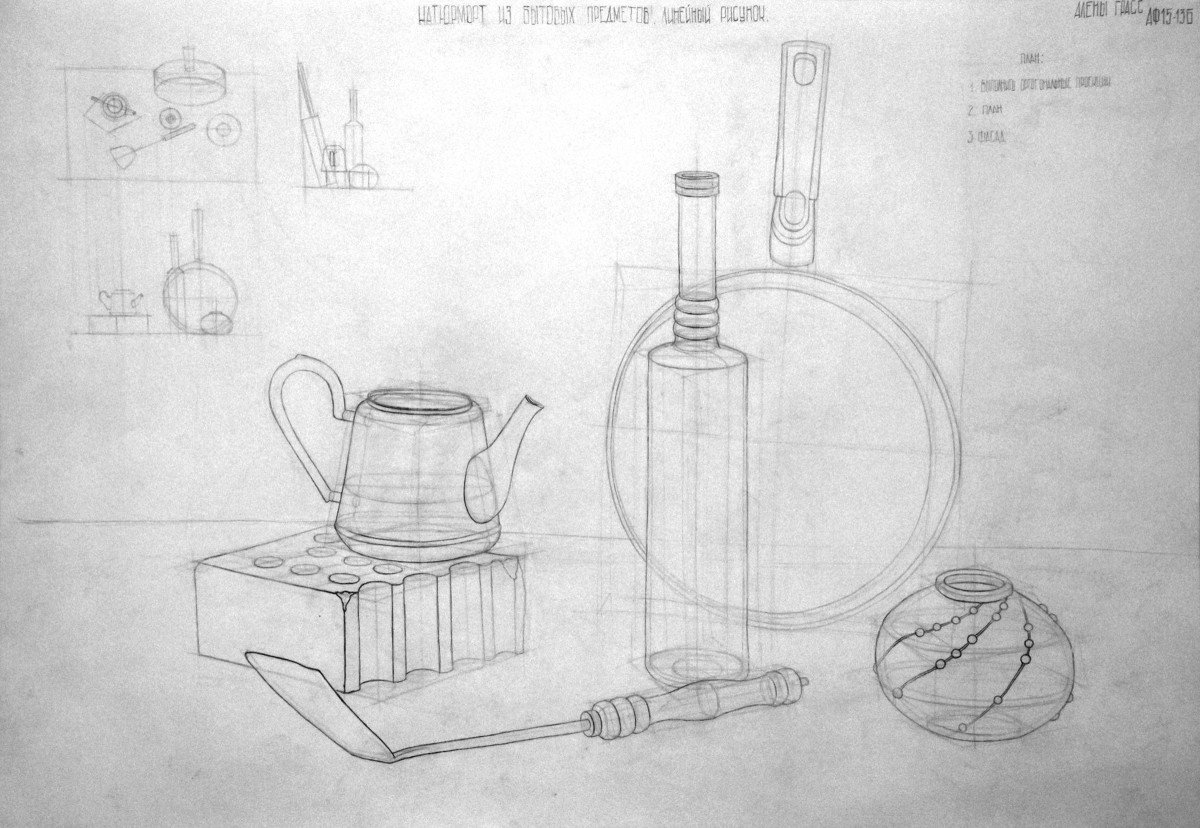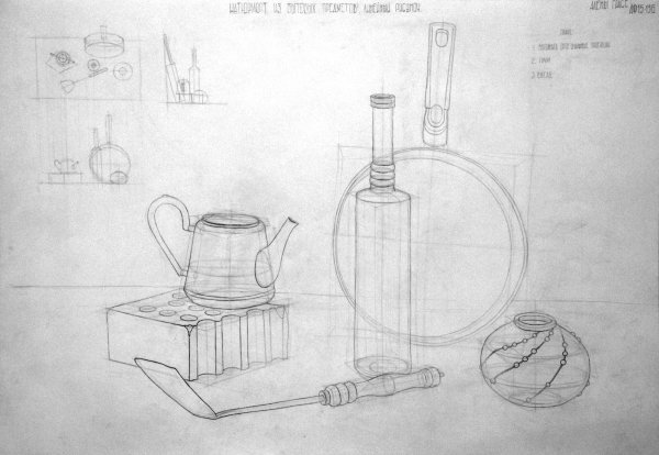 Конструктивный рисунок натюрморта из бытовых предметов карандашом - это процесс создания живописной композиции, в которой используются обычные предметы, находящиеся в быту, и отображение их с помощью карандаша. В таком рисунке основное внимание уделяется структуре и форме предметов, их геометрическим свойствам. Каждый объект здесь имеет свое место и взаимодействует с другими элементами композиции, создавая эстетическое и гармоничное целое. Работая карандашом, можно передать различные оттенки серого, добавляя объем и глубину рисунку. Такой рисунок может быть выразительным и позволит вам насладиться творчеством, развить навыки перспективы и изучить принципы композиции.
