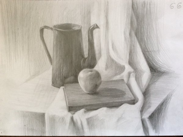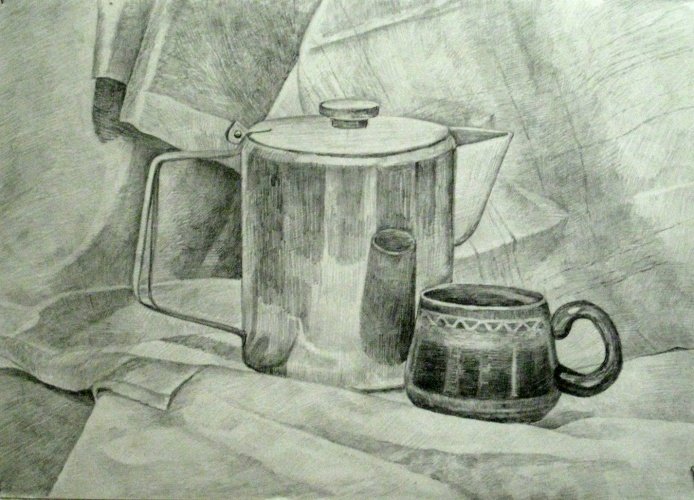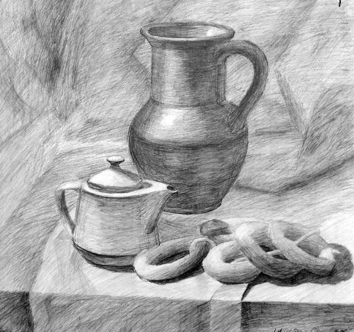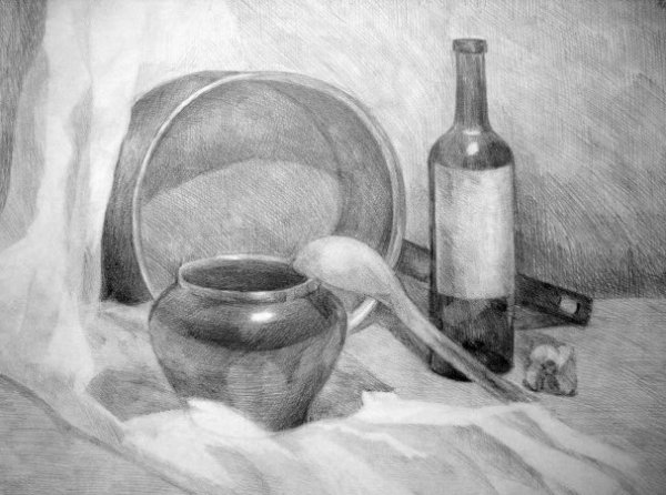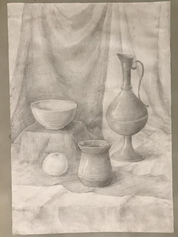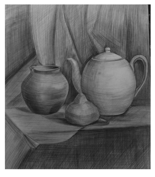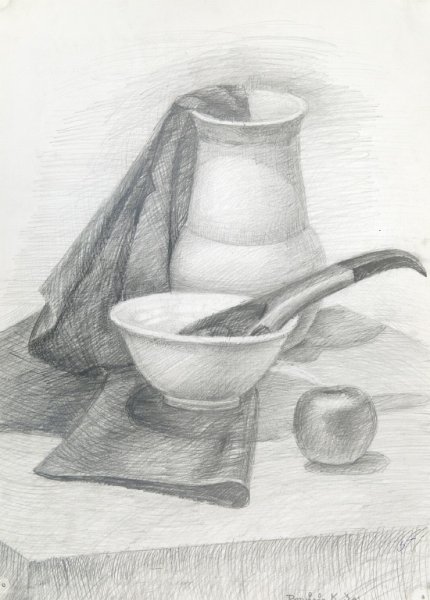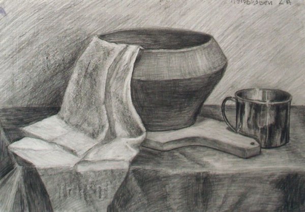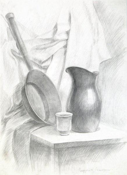Великолепный рисунок натюрморта, изображающий трое предметов быта на гладкой драпировке, привлекает внимание своей элегантностью и художественной проработкой. Нежные линии и оттенки создают ощущение гармонии и спокойствия. Предметы быта, размещенные на драпировке, воплощают уникальную комбинацию функциональности и эстетического восхищения. Каждая деталь тщательно проработана, передавая ее форму, текстуру и оттенки с большой точностью и мастерством. Рисунок позволяет зрителю насладиться красотой простых предметов, которые часто упускаются в повседневной суете. Это искусство, которое приковывает взгляд и заставляет задуматься о красоте в простых вещах, окружающих нас каждый день.