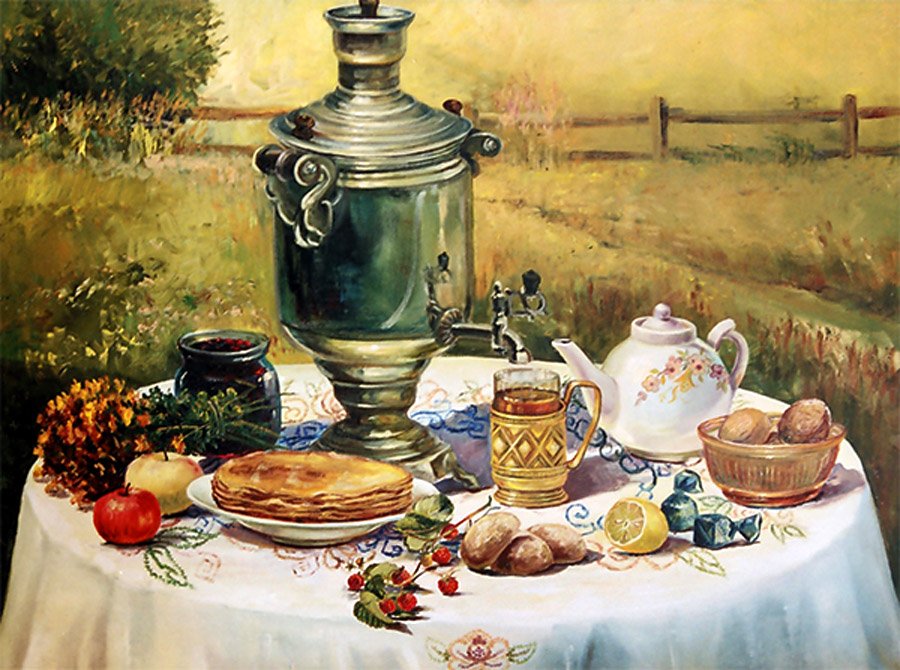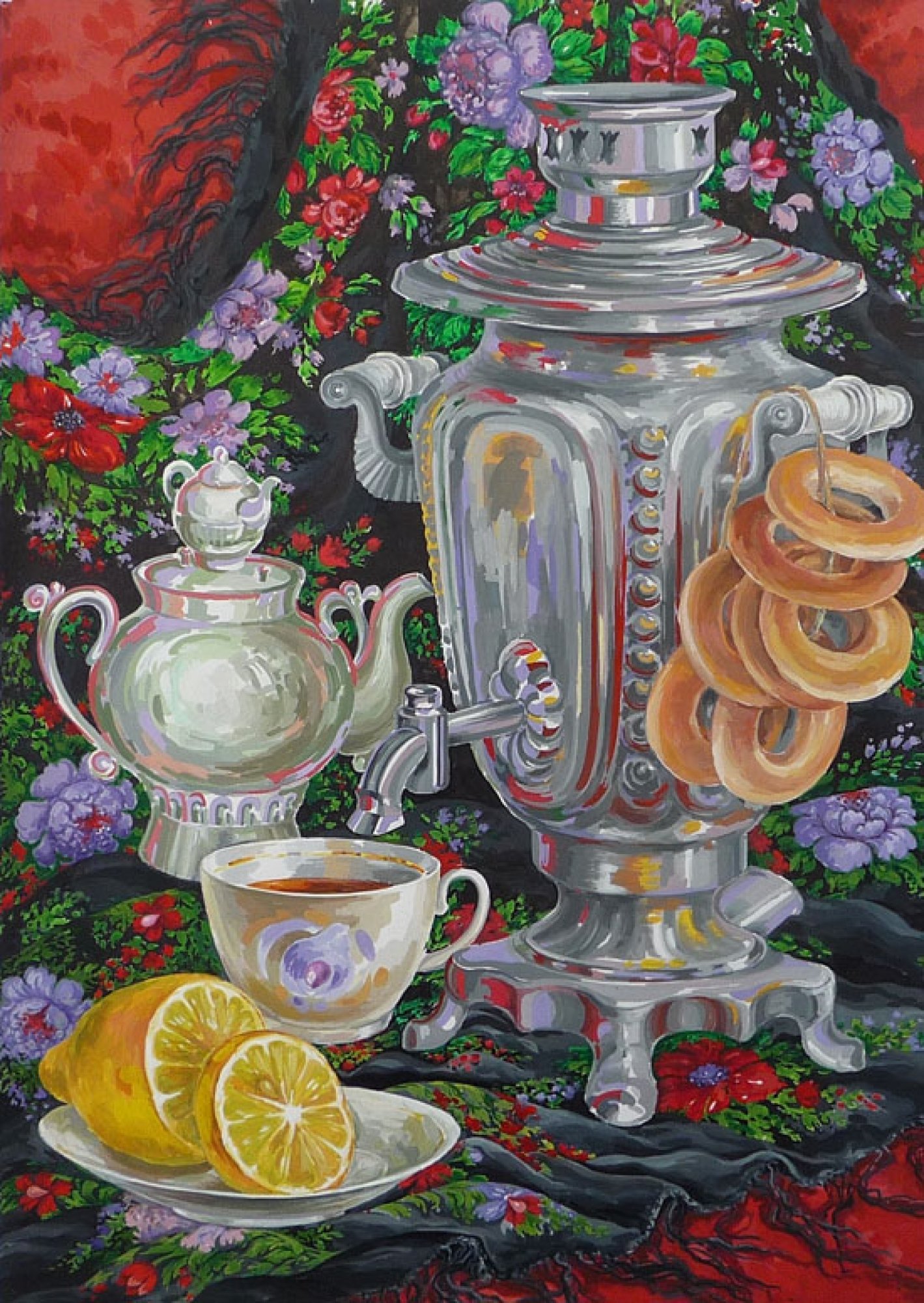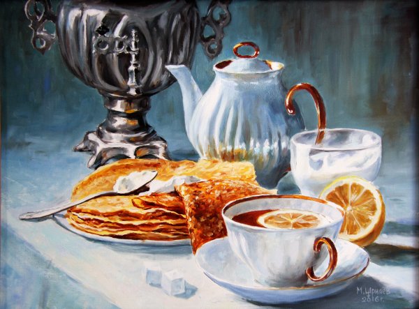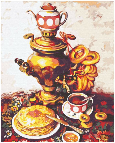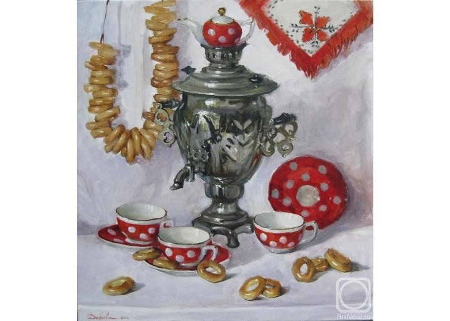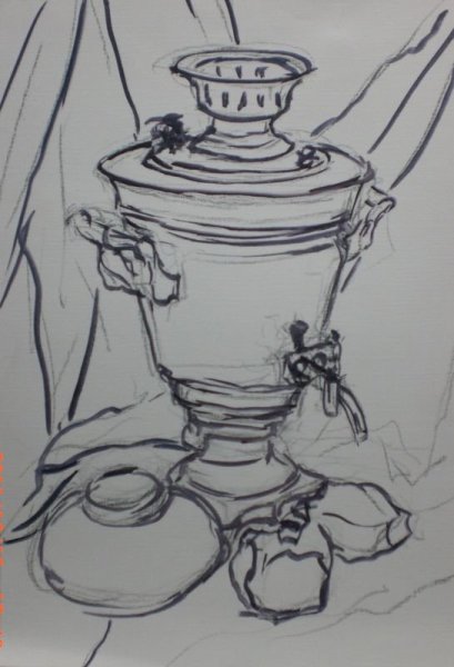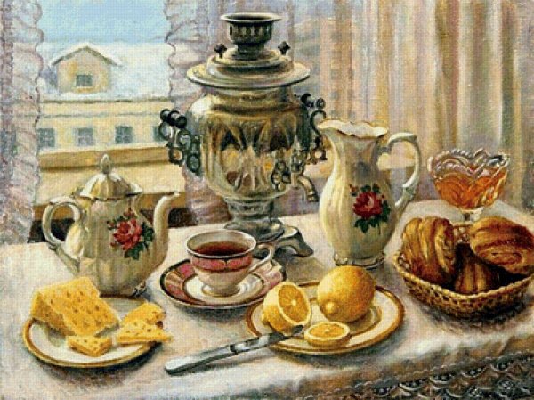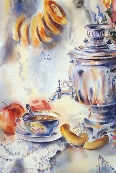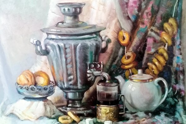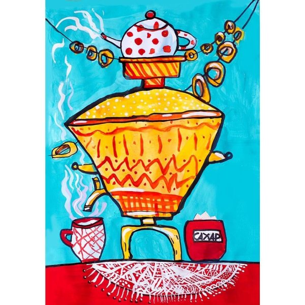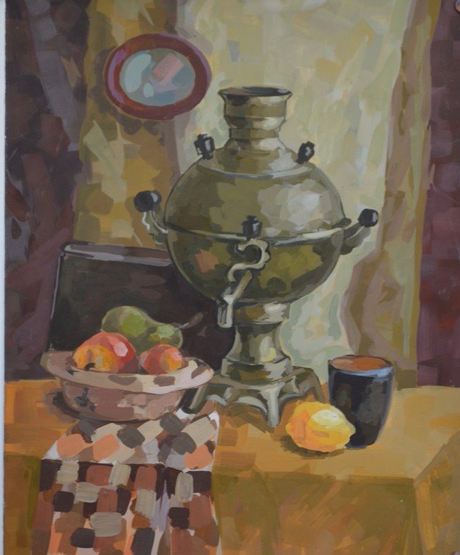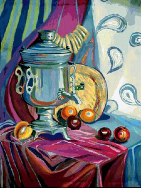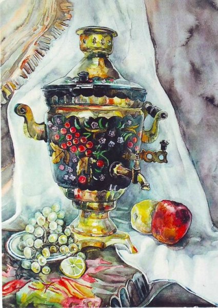 Этот уникальный натюрморт представляет собой изящный рисунок, на котором изображены самовар и чашка. Композиция великолепно передает атмосферу уюта и тепла, так характерную для домашнего огня и чаепития. Самовар, украшенный изысканными узорами, выглядит очень изящно и привлекает внимание своей элегантностью. Его медные оттенки прекрасно сочетаются с яркими красками чашки, добавляя образу яркости и жизнерадостности. Каждая деталь рисунка тщательно проработана, что придает ему особый шарм и создает ощущение реальности. Это произведение искусства станет прекрасным украшением любого интерьера, придаст ему изысканности и уникальности.