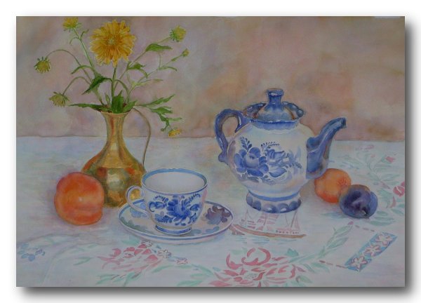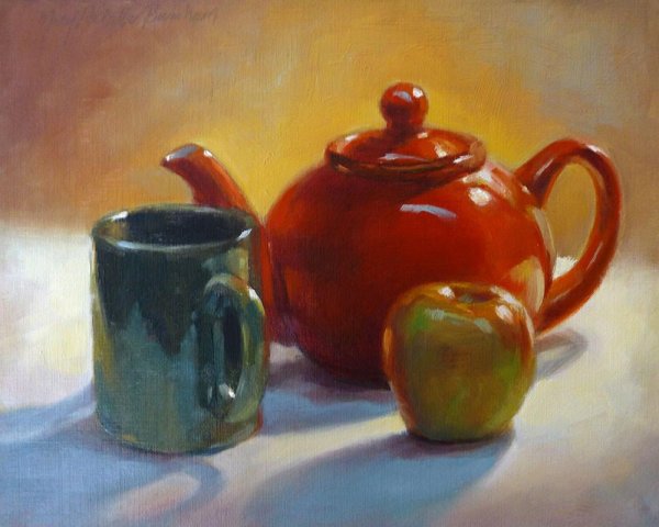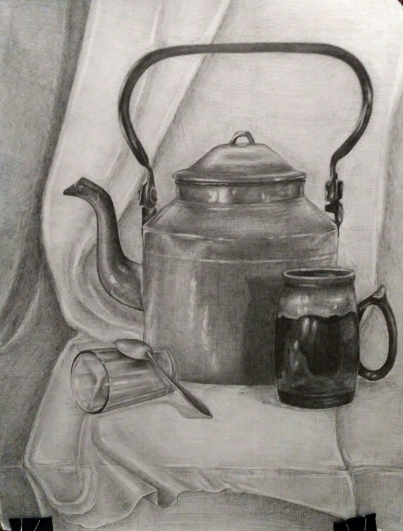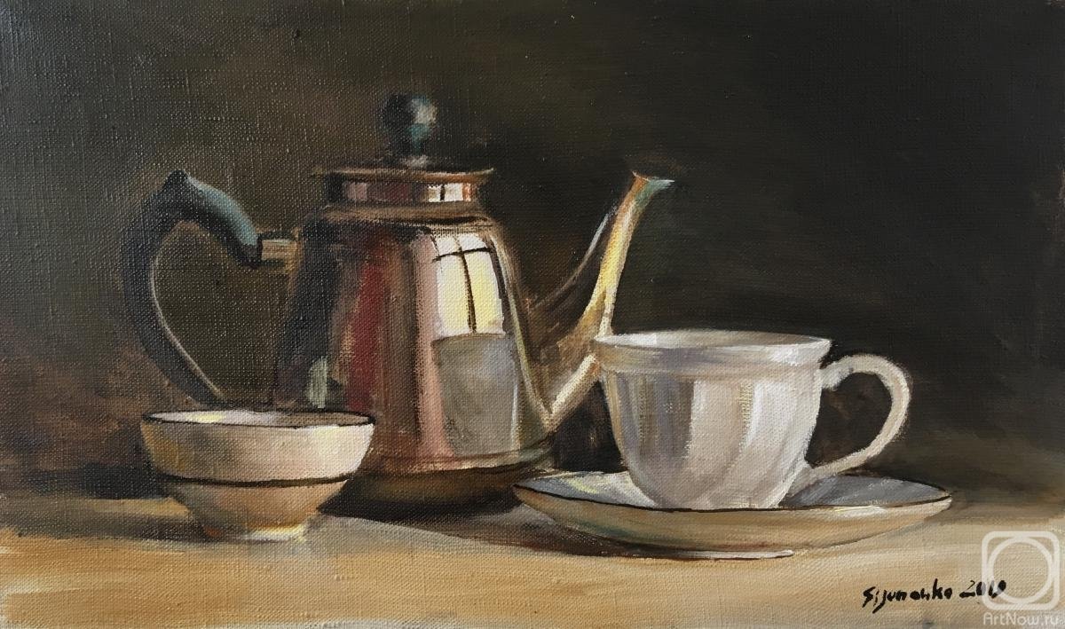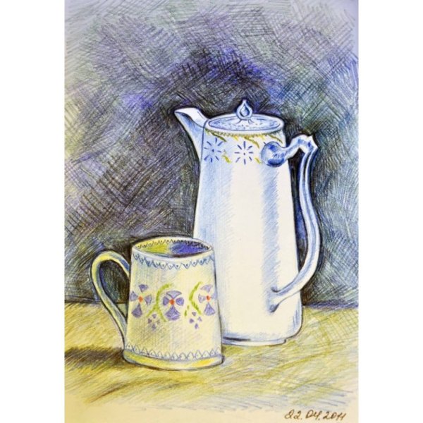 Великолепный натюрморт, запечатлевший красоту и элегантность, представляет собой уникальный рисунок чайника и чашки. Чайник изящно вылит из металла, его гладкая поверхность отражает окружающий мир. Чашка, расположенная рядом с ним, обладает изысканным дизайном, ее форма придаёт ощущение комфорта и уюта. Изображение захватывает внимание зрителя своей тонкой проработкой деталей, позволяя полностью почувствовать атмосферу спокойного чаепития. Этот натюрморт создает гармоничное сочетание цветов и форм, отражая идеальную симбиоз между функциональностью и эстетикой. Это произведение искусства является не только привлекательным для глаз, но и вызывает глубокие эмоции, перенося нас в мир умиротворения и наслаждения.