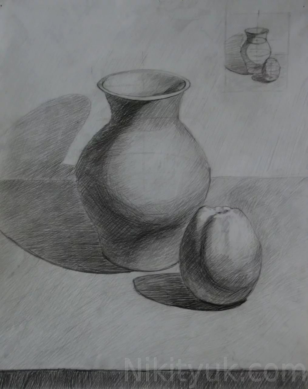 Этот натюрморт, выполненный карандашом, притягивает взгляд своей уникальностью и мастерством исполнения. Художник с ловкостью руки передал игру света и тени на объектах, что создает ощущение глубины и объемности. Каждая деталь изображения точно проработана, от мельчайших текстур до тонких переходов цветов. Натюрморт мгновенно захватывает воображение зрителя, позволяя войти в мир изображенных предметов и насладиться красотой их формы и композиции. Этот рисунок является искусством, которое оставляет след в сердце каждого зрителя.