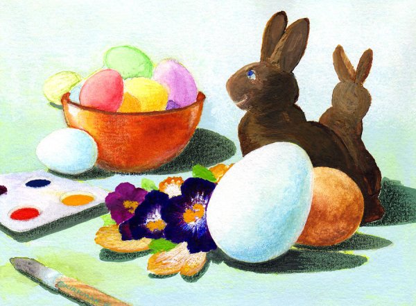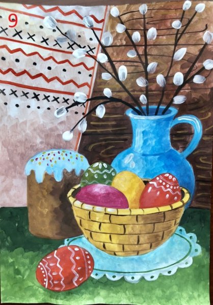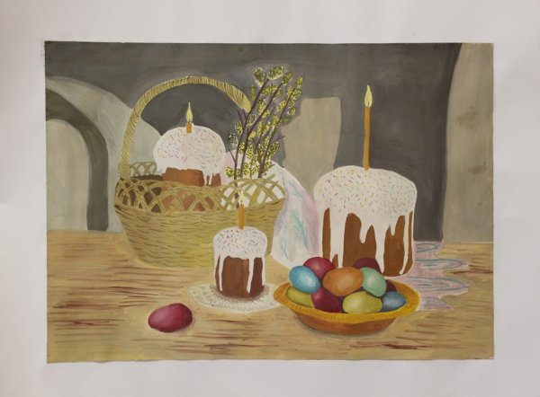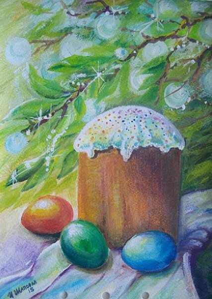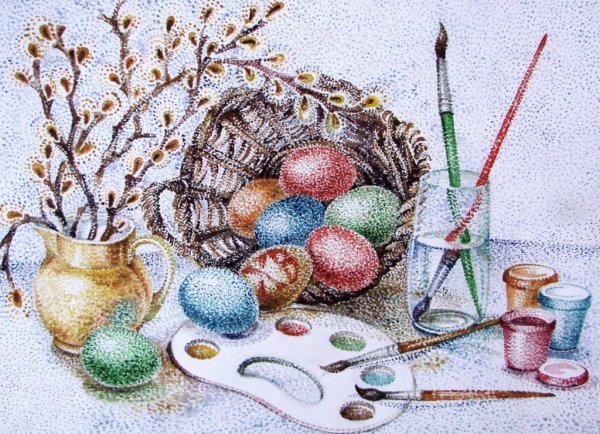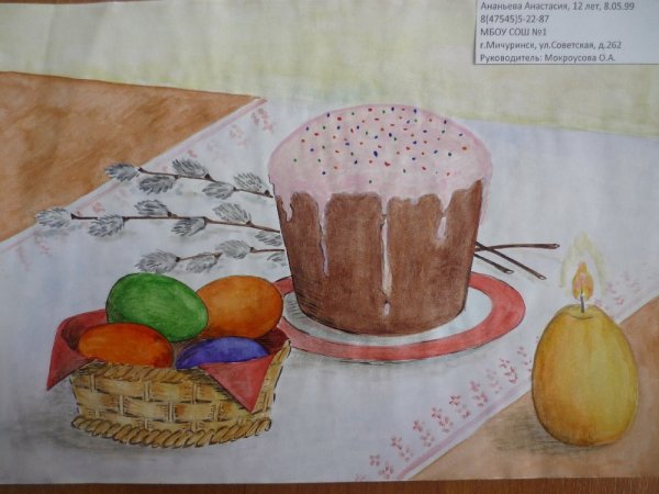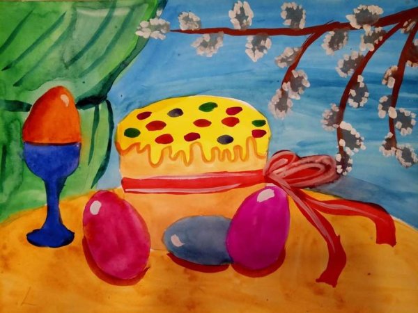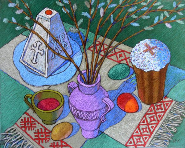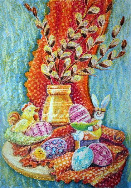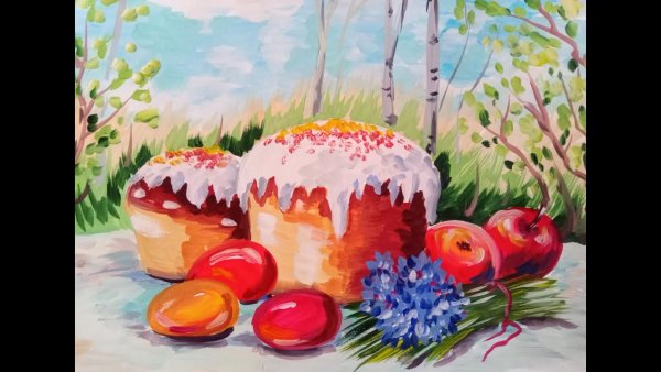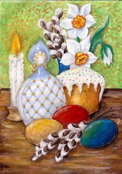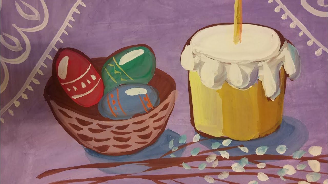 Рисунок натюрморт "Пасха" - это красивое и символичное изображение, которое отражает особенности этого важного праздника. На рисунке можно увидеть разноцветные пасхальные яйца, они являются главным символом Пасхи и символизируют новую жизнь и воскрешение. Яркие и насыщенные цвета яиц добавляют эффектной динамики и радостного настроения. Возможно, на рисунке также изображены пасхальные корзины с травой, цветами и другими пасхальными атрибутами. Весь рисунок создает атмосферу торжества и передает великолепие и волшебство праздника Пасхи.